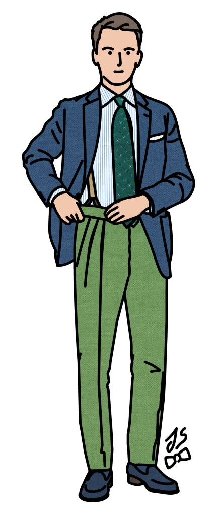 La question du mariage des couleurs est d’ailleurs ce qui effraie la plupart des hommes. Et ce n’est pas un hasard si l’on associe si vite la couleur à certaines traditions britanniques caricaturales, celles où l’on confond allègrement l’excentricité avec l’élégance. Il suffit d’observer certains “anglais de roman” ou certains anglais bien réels, hélas pour comprendre comment la couleur devient une démonstration. Trop de contrastes, trop de motifs, trop de certitudes, pour un résultat immédiat : on ne voit plus l’homme, on voit la performance. C’est ce danger qui nourrit la prudence du vestiaire classique : mieux vaut la neutralité que l’outrance. Mais la prudence ne finit-elle pas aussi par appauvrir ? La couleur, lorsqu’elle est bien maniée n’est pas une crise d’adolescence : c’est un raffinement.