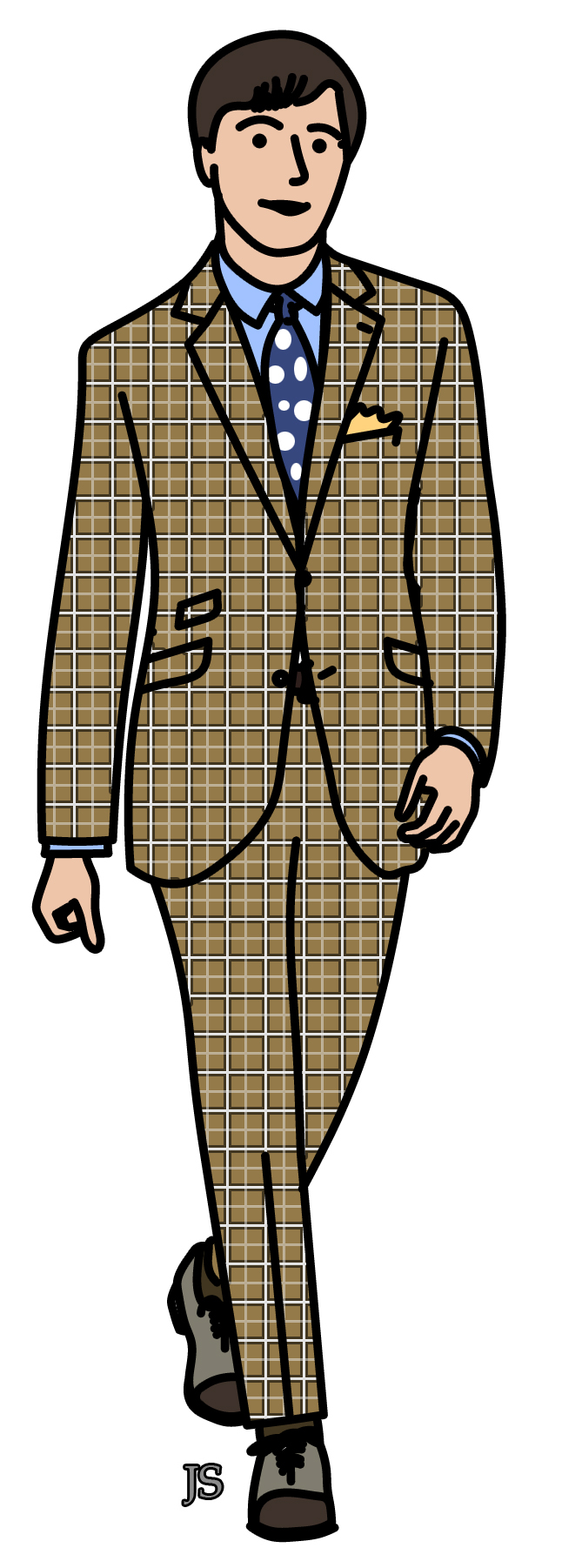 Pour ce qui est du port du prince de Galles, ce bon compromis entre tissu sport et tissu ville, il est varié et souvent de bon goût. Il permet de porter un motif carreau sans que cela devienne fatiguant. Il est le plus souvent très discret, mis à part peut-être ces princes de Galles des années 30 présentant un format supersized… Deux grandes couleurs dominent: le beige estival (ci-dessus) et le gris plus hivernal (ci-dessous). Ceci dit, cette différenciation n’est qu’une proposition de style, le prince de galles porté en journée peut être très polyvalent, à la ville comme à la campagne ou dans une gare de la côte amalfitaine à côté de vos malles…