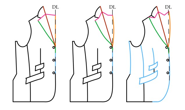 Voici figurés trois devants gauches à trois boutons, avec assemblés le devant et le petit côté. La pince recoupe les poches. La ligne rouge foncée représente l’axe de symétrie du revers, sur lequel on le pivote. Faites l’essaie avec votre veste, vous comprendrez.