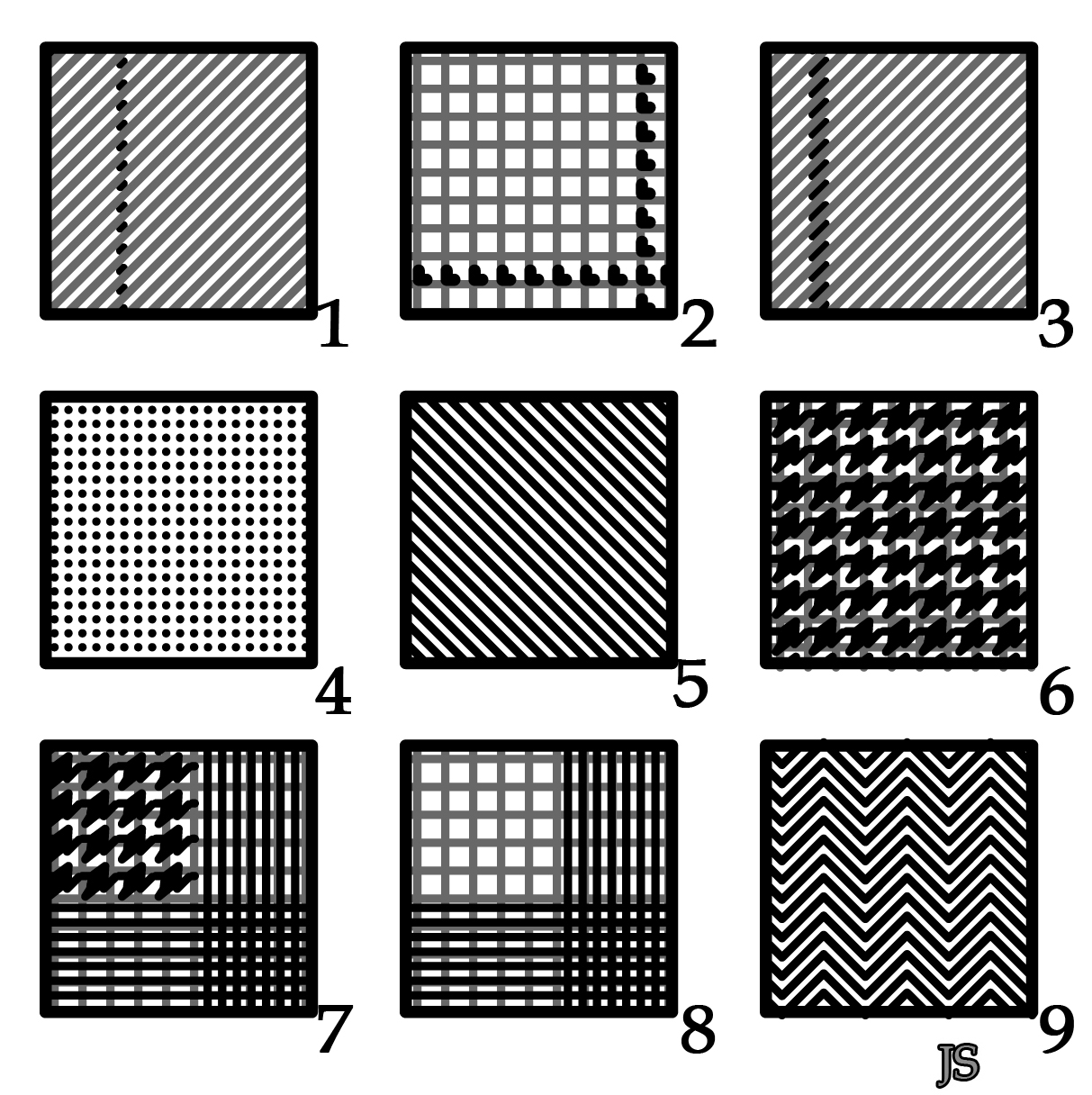 8- Armure toile, motif prince de Galles. Tissage excessivement connu, souvent du meilleur effet.