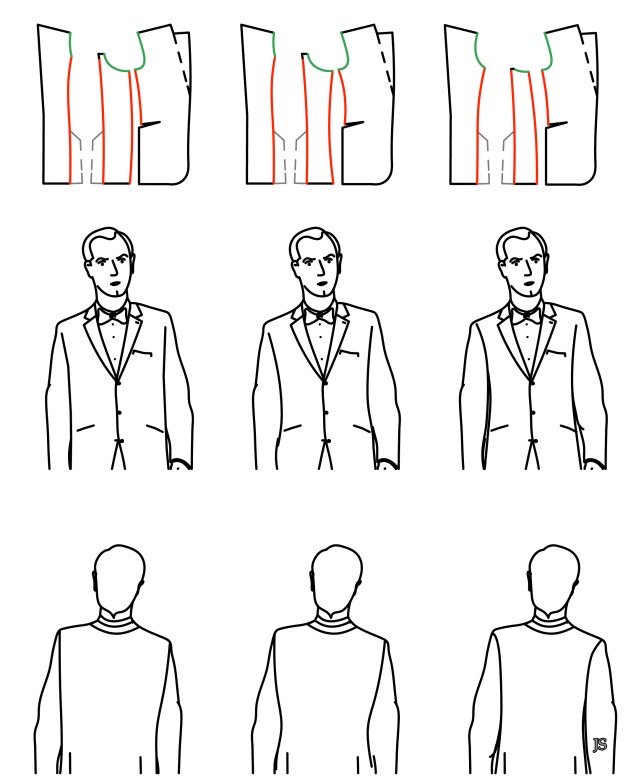 La coupe cherche perpétuellement à renouveler ses codes. Les schémas ci-dessous représentent trois stades d’évolution de cette dernière. Une veste se compose principalement de deux devants, de deux petits-côtés et du dos en deux parties aussi. Sur les schémas, ils sont représentés en haut à plat. En rouge les bords qui seront piqués ensemble, en vert l’emmanchure de la manche. Donc le premier schéma représente la version de base, datée années 50. Le petit côté (celui du milieu) est relativement droit et se termine par le bas de l’emmanchure. Il se raccorde sur le devant en tangente horizontale et se raccorde sur le dos en tangente quasi verticale. Le dos est donc peu marqué par les manches.