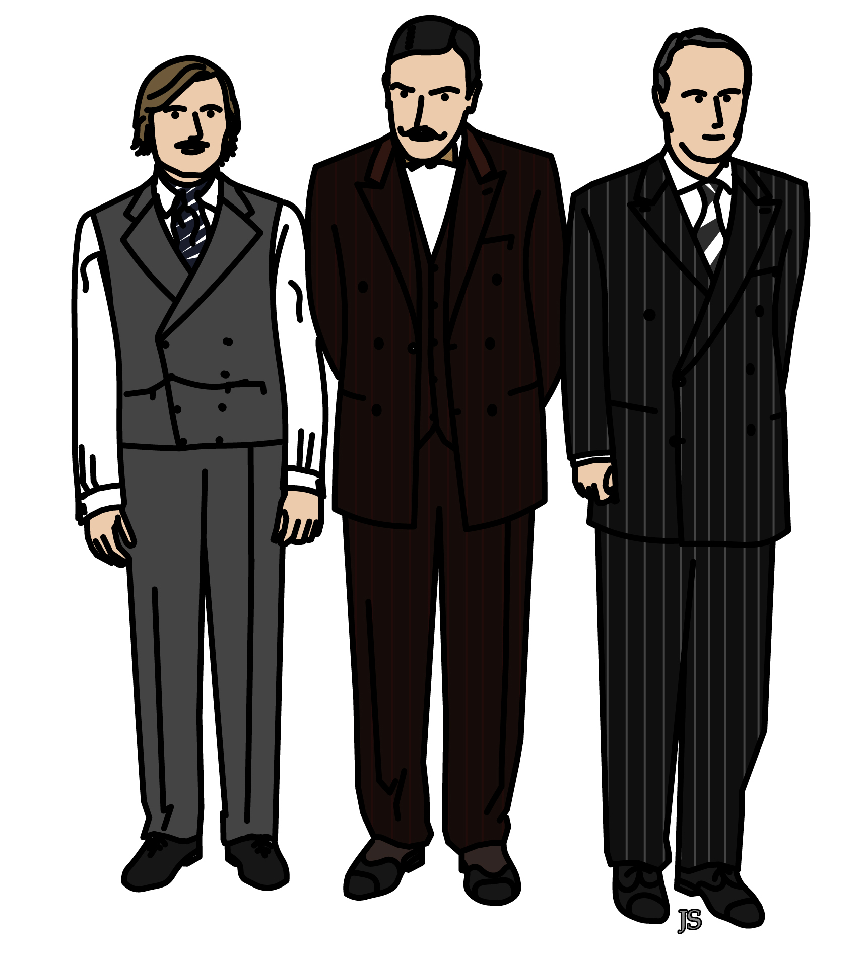 Cette série d’article est maintenant finie, après un tour complet des personnages masculins et de leurs tenues en dessins. Si l’art costumier dans ce film n’excelle pas forcément, nous retonnons l’atmosphère homogène qui s’en dégage. Notons par exemple la forte présence de tissus à rayures et de coupes généreuses (les revers notamment) tout à fait de bon ton dans l’entre-deux guerres. Retenons aussi la justesse des propositions pour chaque classe sociale, donnant immédiatement une lisibilité à l’ensemble des ‘jurés’, comme un condensé de la société, justifiant plus ou moins moralement le sort réservé à Ratchett; les domestiques, suivant leur rang, ressemblent à des domestiques, les aristocrates de même. En revanche nous penserons à regret à la faible présence de mouchoirs de pochettes. Notons enfin que les costumes sont un savant mélange d’un style des années 30 rêvé et de la mode des années 70. Car nous le savons bien entre gentlemen, les années 30 restent une référence en terme d’élégance, mais elles sont bien souvent réinterprétés -malgré nous ou consciemment- dans un esprit plus ‘contemporain’…