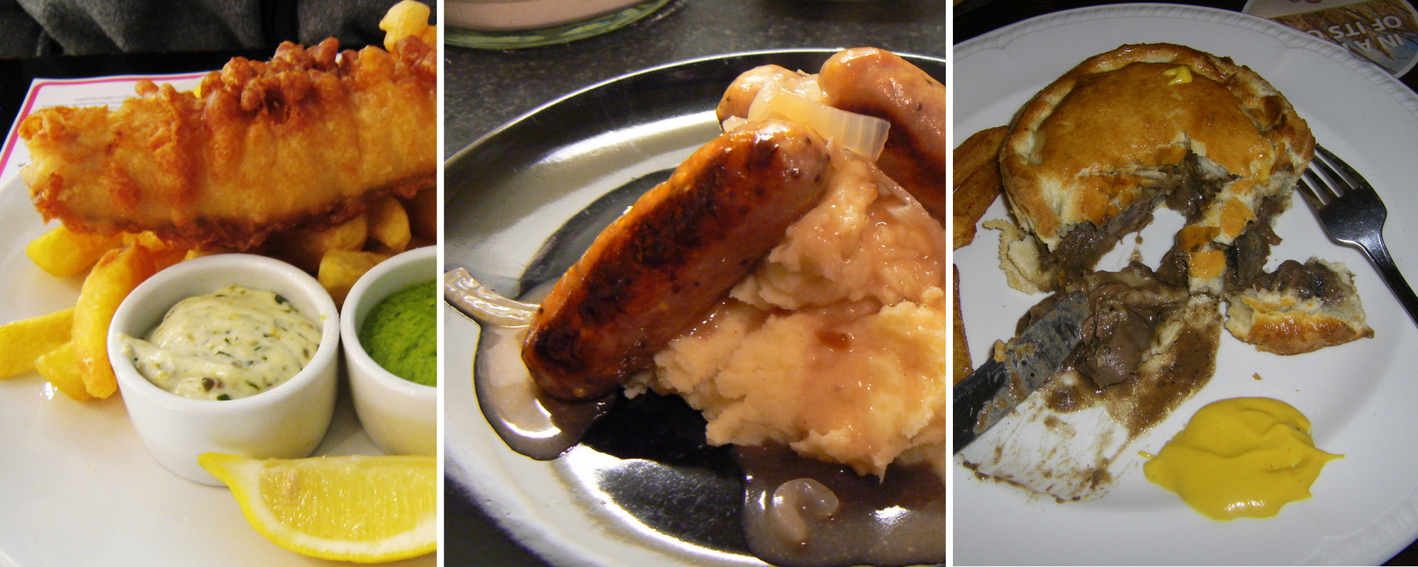 Fish and Chips, Sausages on mash potatoes et Kidney Pie, le nec plus ultra de la cuisine anglaise, avec une half pint de Guiness (parcequ’il faut être modéré): parfait!