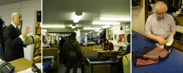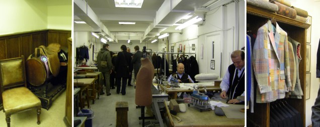 Dans une cabine d’essayage se trouve encore un cheval d’arçon qui permet de visualiser le bon tombé des culottes de cheval et autre hunt jacket. Au sous-sol (enfin plutôt cour à l’anglaise) se situent les ateliers d’apiéceurs. C’est ici que la veste prend forme sous les mains des ouvriers apiéceurs. Enfin, au finishing se trouvait une veste curieuse faite de chutes de tweed: wonderful!