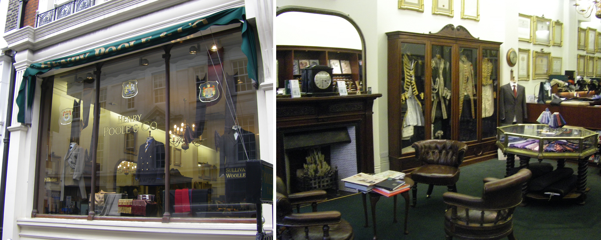 Henry Poole et Co pour finir ce tour d’horizon, est la maison la plus prestigieuse au 15 de Savile Row. C’est ici que fut inventé le smoking (dinner jacket), c’est d’ici que sortent les uniformes royaux, c’est ici que les cours du monde entier s’habillaient, c’est ici que le snob V. Giscard d’Estaing se faisait tailler des costumes, bref, une adresse incontournable, à l’ancienne!