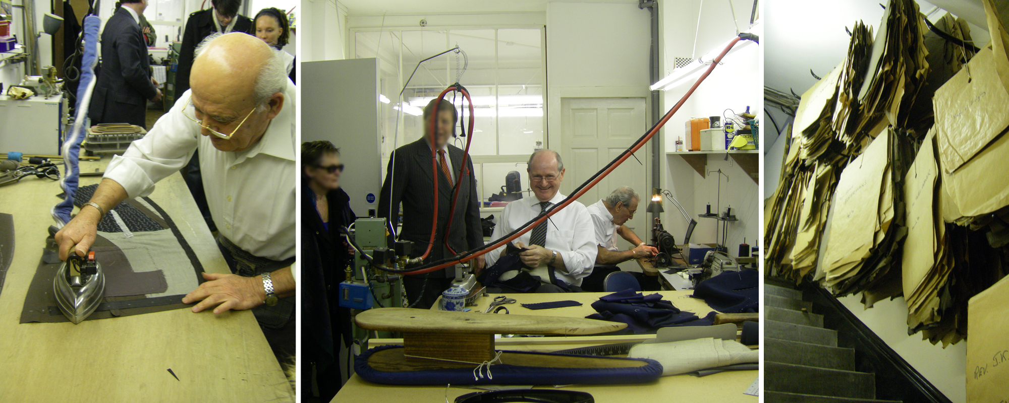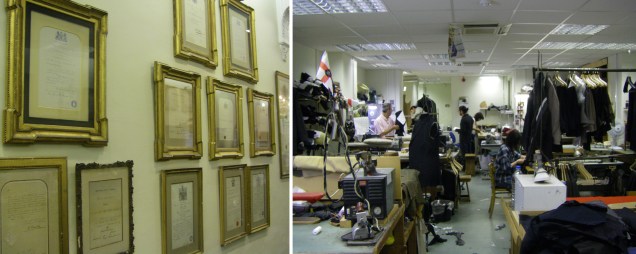 Remontant à 1781, l’épopée de la maison Henry Poole et Co se confond avec l’Histoire dont ces warrants (appointements) royaux et impériaux sont l’expression. Aux ateliers, sous l’apparent foutoir, le travail continue, avec le même soin pour le bien fait et pour la transmission. Ici aussi, de nombreux jeunes issus d’écoles de mode passent. Comment être grand styliste sans connaitre et appréhender la confection traditionnelle? Comment bousculer les codes sans les connaitres? Alexander McQueen ou Tom Ford sont par exemple passés chez Anderson & Sheppard.