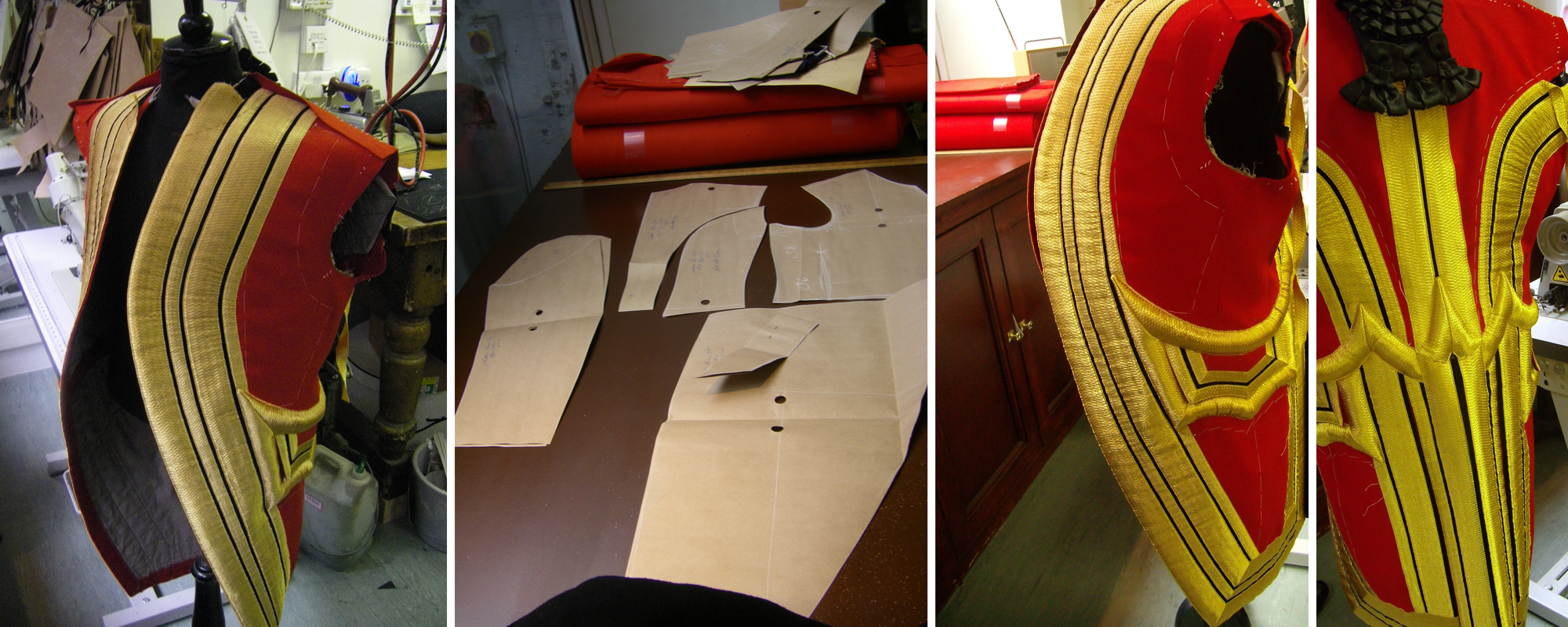 Parfait exemple du mélange tradition et modernité, dans un bel esprit de continuité, une livrée royale en cour de confection. Ce modèle fut réalisé pour le couronnement de la reine Élisabeth II, pour les gardes suivants. A l’occasion du jubilé 1952-2012, toutes ces livrées sont re-réalisées, en sur-mesure bien sûr. Mais il faut trois mois pour réaliser une de ces tenues complète (jaquette + gilet + culotte), alors on prend de l’avance… La laine rouge est éditée exclusivement pour Her Majesty’s Armed Forces, sur laquelle est posée par endroit du velours de soie bleue, surmontée de galons de fils d’or, exclusivement tissés à Lyon pour la couronne. L’ensemble dort la nuit dans un coffre à cause de sa valeur intrinsèque…
