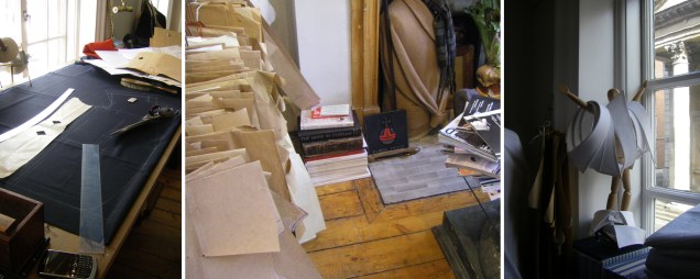 La boutique, puis la devanture et le vestibule d’entrée. C’est ici que se décident les premiers choix stylistiques avec le client, que le tailleur écoute et analyse ses volontés et desiderata…