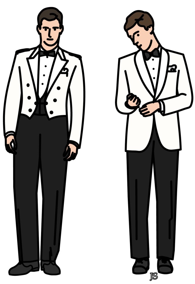 Nos amis d’outre atlantique ont une préférence visiblement pour le col châle, qui a connu un pique d’utilisation au cours des années 60/70. J’aurais tendance à dire que cette version est peut-être plus américaine qu’anglaise, très Miami ou New York estival. Il me semble aussi que dans le film ‘Attrape moi si tu peux‘ est donnée une fête de mariage dans un jardin sudiste, où tous les convives sont en smoking blancs. Cela donne une esthétique très ‘brooks brothers’, très policée.