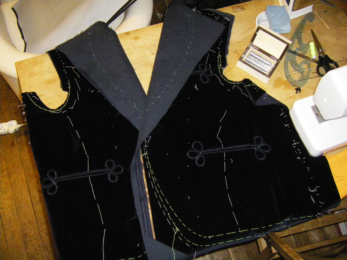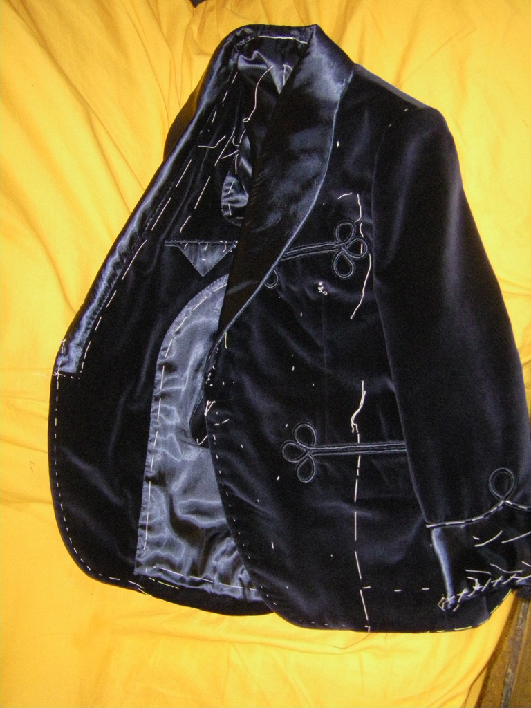 Je sais que nombre d’entre vous sont des adorateurs des fabuleuses vestes d’intérieures. Figurez-vous que j’ai reçu commande d’un tel modèle, dans un velours bleu nuit, avec fermoir à brandebourg et galon autour des poches et bas de manches, suivant ce modèle:Si la veste a subi un premier essayage vendredi, je me suis levé ce matin aux aurores pour continuer et poser les fameux galons… un travail à s’arracher les cheveux, et surtout à se piquer les doigts moult fois, mais je suis plutôt satisfait: