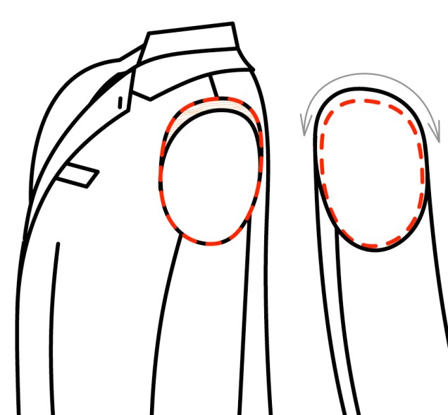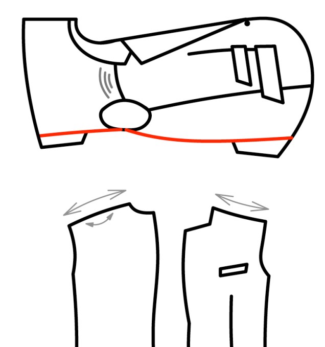 Ensuite vient le travail non plus sur l’emmanchure, mais sur l’épaule elle-même et sa couture. La encore le travail au fer chaud est important. Comme montré sur le schéma ci-dessous, à la coupe, on taille différemment le haut du dos et le haut du devant (flèche grise). La couture dos fait souvent un pouce de plus que le devant. Il consiste alors à rentrer ce surplus. Chez Cifonelli, c’est au moins 3cm qui sont repoussés sur le dos. Cette ‘souplesse’ ne bouge plus sur la piqure même d’épaule. En revanche, dans le haut du dos, elle se libère (vibration grise en dessous) et donne au dos du galbe pour les omoplates.