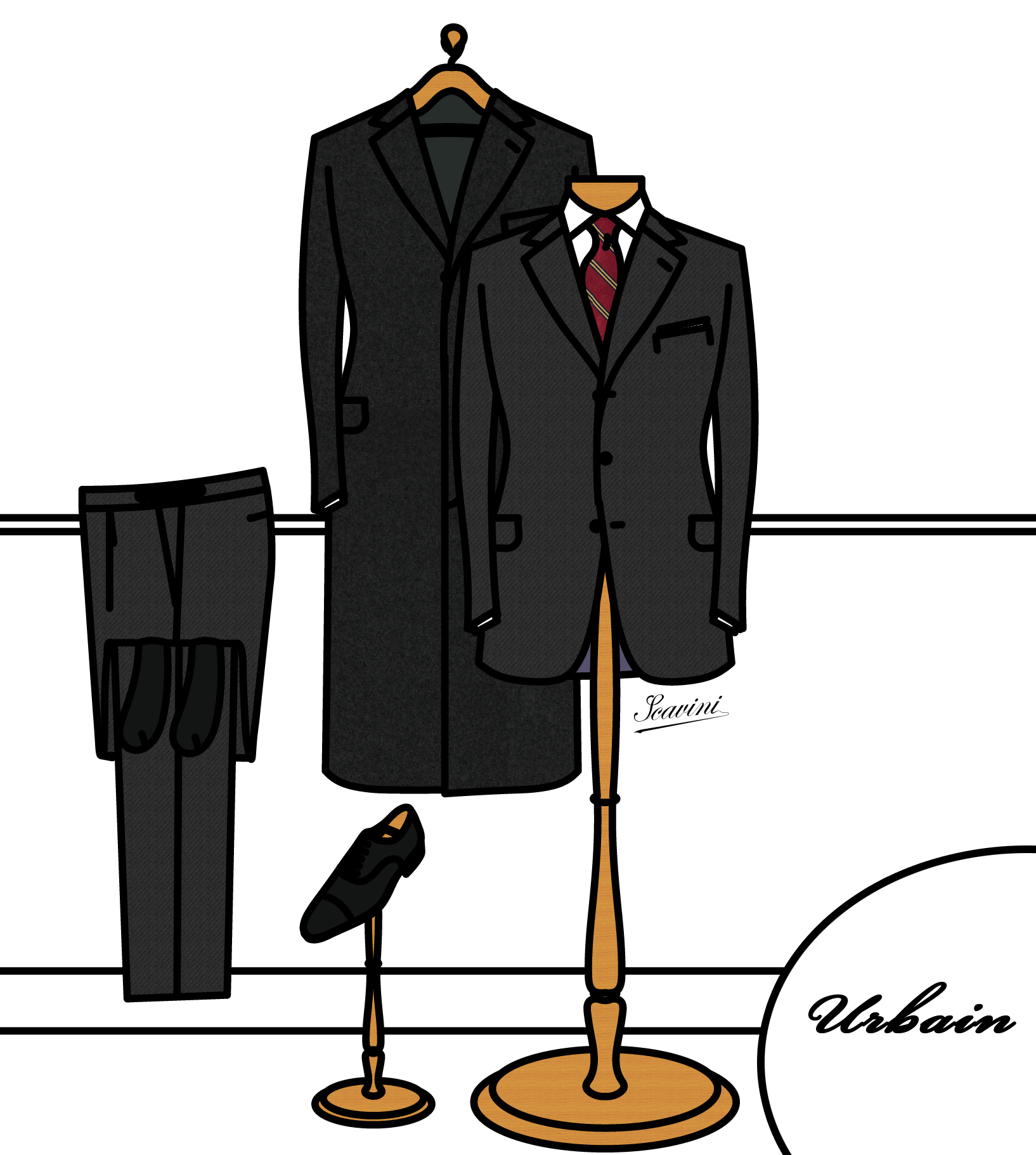 Avec cet ensemble au goût sobre, vous pourrez acheter un pardessus foncé, à poches côtés et non ventrale et à boutons cachés (le mieux) que vous pourrez porter l’hiver, avec des gants noirs et un parapluie roulé. Complétez par des chaussettes sombres et de beaux richelieus à bout rapporté, qui vieillissent mieux. Et jamais de mocassins avec les costumes. Enfin, le chapeau le plus adapté à ce registre serait certainement le Trilby, en coloris foncé.