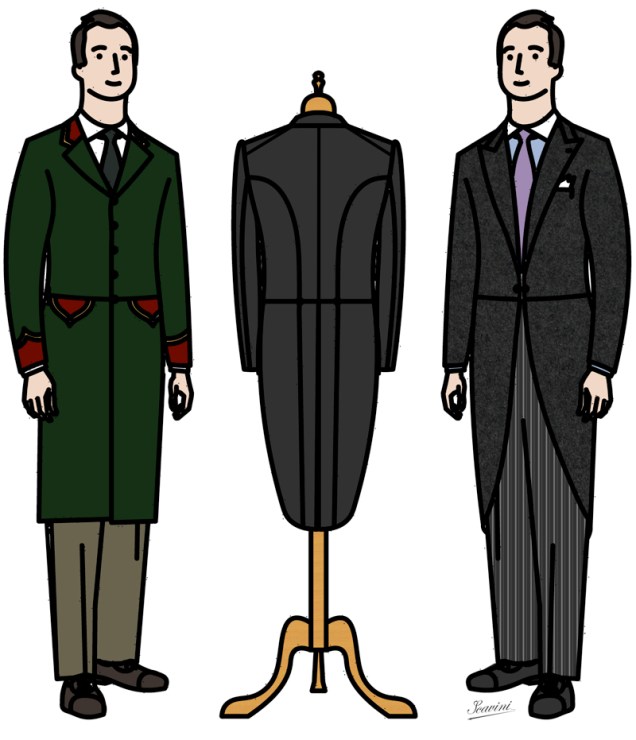 Une fois que ce haut est validé, que son bien aller est contrôlé, il est possible d’y accrocher le bas. Le plus souvent, celui-ci présente une forme particulière, avec des basques rondes, fuyantes ou arrondies, comme sur les tenues de mariage. Les manteaux de chasse à courre sont plus classiques avec un bas droit, mais le dos est le même, avec une longue fente centrale à partir de la taille, et deux boutons, situés de part et d’autre sur cette ligne. Ils sont souvent la signature de ces vêtements, quelques fois appelés redingote, même si ce terme recouvre une pièce plus précise encore.