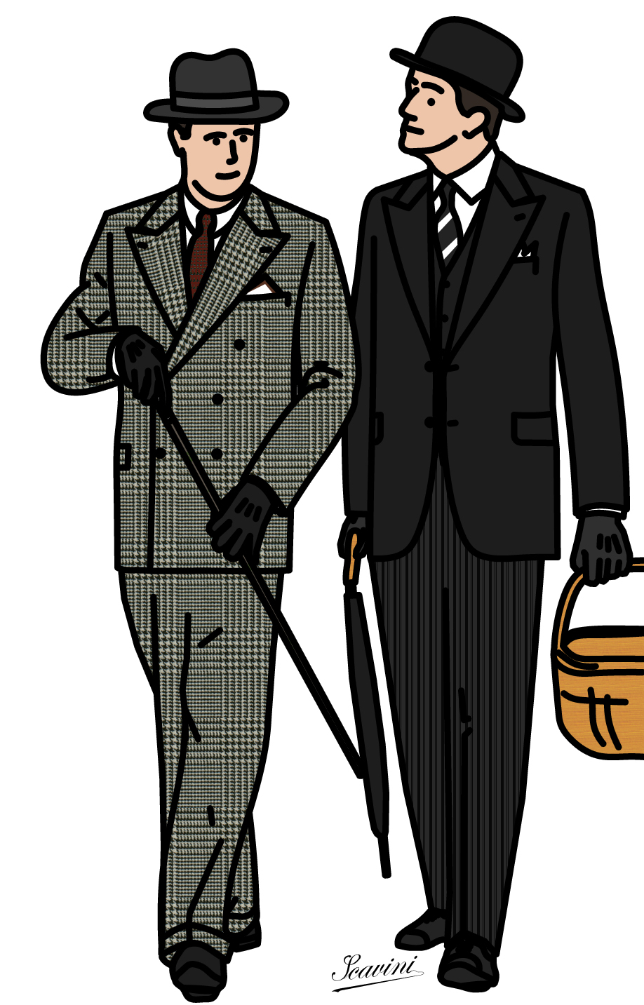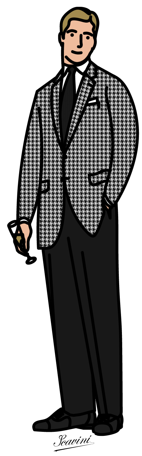 La veste sport doit être accompagnée de souliers marrons, ce qui la cantonne à la journée. Je n’aurais pas idée de débarquer à une soirée en souliers marrons et veste dépareillée. Le costume me paraitrait la meilleure option, sans aller forcément vers le smoking. Or ici, la veste est seule, en petit pied-de-poule noir (celui dont je n’aurais jamais su quoi faire auparavant) et accompagnée d’un pantalon noir. Je partage avec le Chouan son avis sur le pantalon noir. Mais ici, c’est la seule option qui paraisse viable. Avec les richelieus noirs et la cravate noire, cela crée un ensemble cohérent, qui ne fait pas garçon de café et qui convient absolument (de mon pur avis très subjectif) à une soirée, si le smoking n’est pas exigé. Sachant qu’évidemment aujourd’hui, rien n’est jamais exigé et que les gens croient bon de venir en jeans, à un vernissage par exemple.