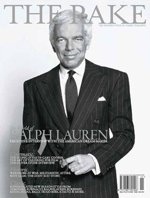 MàJ: pour illustrer un drape cut intéressant, je mets en ligne cette couverture de The Rake Mag représentant Ralph Lauren qui affectionne cette coupe : épaules larges (alors qu’il est petit) et poitrines boursouflées :