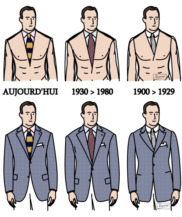 Enfin dernière technique, celle des années 20, celle des hommes-enfants, des hommes loin du front, des hommes des années folles… Le montage n’était ni naturaliste ni baroque, mais légèrement triché, dandy dirions-nous aujourd’hui même si le terme est impropre. Ici, les vestes cherchent la petitesse. Les hommes doivent paraitre des garçons, la jeunesse est chérie, c’est l’époque, les hommes ont été tués. Les épaules sont dessinées très rentrées, quasiment sans épaulettes. Les têtes de manches sont fuyantes. Aucune triche ici, presque même un naturalisme comparable aux envies actuelles. Mais pour arriver à une telle prouesse, il faut impérativement réaliser une tête de manche minuscule, comme un t-shirt. De même la taille était serrée, très serrée. Et seule triche : le bassin très ample, parfois même rembourré pour donner du tour de bassin, des hanches larges, presque féminines.