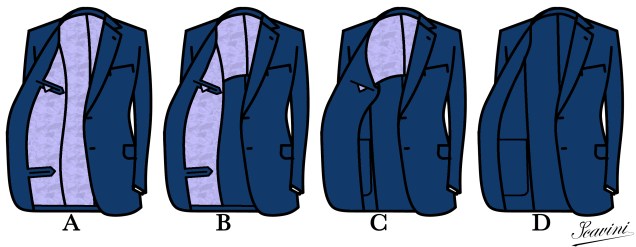 D – le non-doublé intégral, quelque fois appelé veste foulard. Ici, il n’existe plus aucune poche à l’intérieur. De même la toile disparait, comme les épaulettes. Le montage de la tête de manche est plutôt comme une chemise. La structure disparait, la veste est molle, effectivement comme un foulard, ce qui peut être idéal pour des cachemires bi-faces bi-colores.