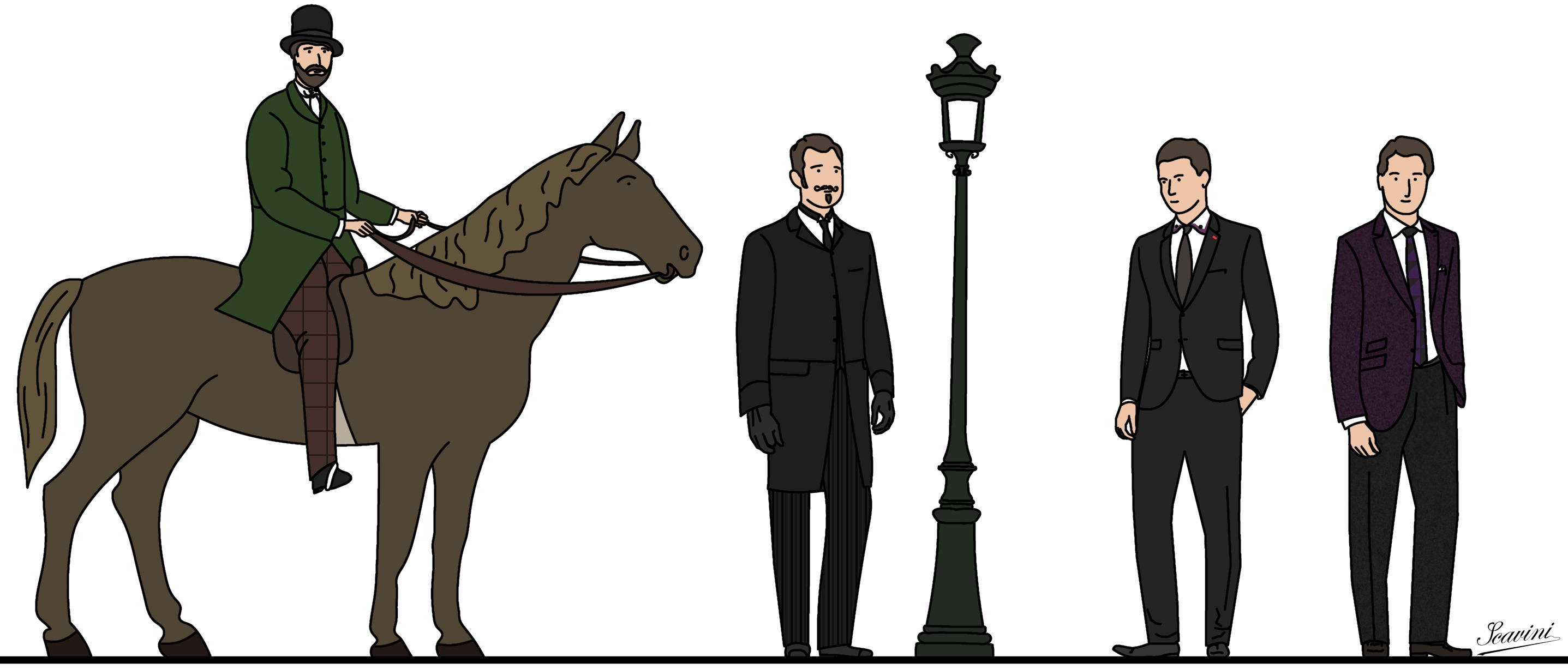 Il peut être noté qu’historiquement, le costume veste + pantalon identiques, ou ‘tout de même’ est une anomalie. Anomalie qui apparue vers 1920 pour se prolonger de nos jours, avec un pic autour de la seconde guerre mondiale et des 60’s. Jamais auparavant n’avait-on assisté à une telle unité. Cela n’était tout simplement pas la règle. Le pantalon collant arborait une couleur, quelque fois un motif, la redingote ou le paletot une autre. Et si l’on pousse jusqu’à l’ancien régime, les hommes arboraient autant de couleurs que les femmes (du moins à la cour), ils faisaient les paons.