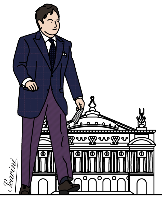 Au premier abord, je dirais un costume. Évidemment, nous sommes en ville, encore mieux à l’Opera de Paris. Cela implique des souliers noirs et une certaine prestance. Mais, j’ai bien senti que ce n’était pas la réponse espérée. Une tenue dépareillée donc, un peu ‘décontractée’ est plutôt envisagée. Oui, car c’est une après-midi autour des enfants. Voilà typiquement le genre de cas qui fait voler en éclat n’importe quel code un tant soit peu ancien. Alors j’ai fait marcher ma petite cervelle, à la fois à contre coeur (j’ai ma réponse 1) et avec intérêt (que vais-je trouver de bien ?). Le fait est que j’ai eu du mal et que j’en ai encore. Pour illustrer cet article, j’ai dessiné une tenue bicolore, autour d’une veste bleu nuit à légers carreaux violets, accompagnée d’un pantalon de moleskine violette également. Chemise et pochette blanches, souliers marrons foncés (voire même veau-velours), cravates à pois discrets.Qui dit mieux ? Certainement beaucoup d’entre vous ? J’aurais pu retirer la cravate et choisir une chemise violet clair. J’avais aussi pensé à une veste en shantung de soie (soie sauvage). Mais je bute sur le pantalon et les souliers à associer. Je ne voulais en revanche pas tomber dans un ensemble trop sport, comme les vestes en tweed. Quoiqu’encore, un costume en tweed donegal bleu soit envisageable… Bref, je continue d’y réfléchir! A vous 😉