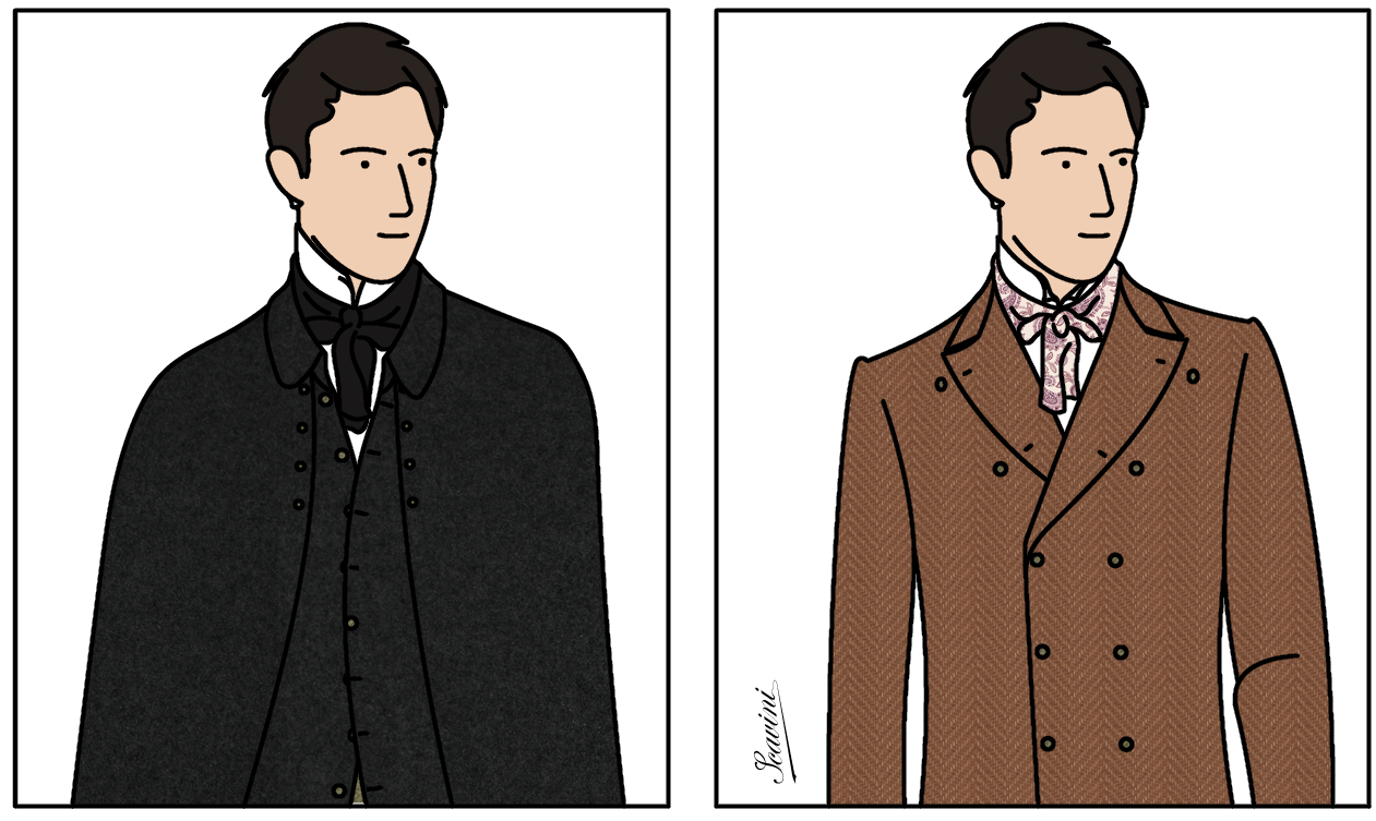 A partir de ces faits, entrons dans les hypothèses, mes recherches étant encore partielles. Ce serait les allemands les premiers qui ont ‘inventé’ la cravate noire. Plus précisément, ce serait les romantiques allemands. Occupant des métiers intellectuels, ils auraient manqué de fonds pour entretenir les fines bandelettes de lin blanc. Vous l’avez sans doute constaté, les cols de chemises blanches se salissent (jaunissent) très vite. Alors que la cravate blanche nécessitait un entretien intensif que seule l’aristocratie pouvait s’offrir, ces jeunes artistes eurent recours, en complément du drap de laine noir à cet artifice plus ‘utilitaire’ (amusante caractéristique allemande). En France, des romantiques comme Balzac eurent recours également à la cravate violette (cravate équivalent ici encore à lavallière).