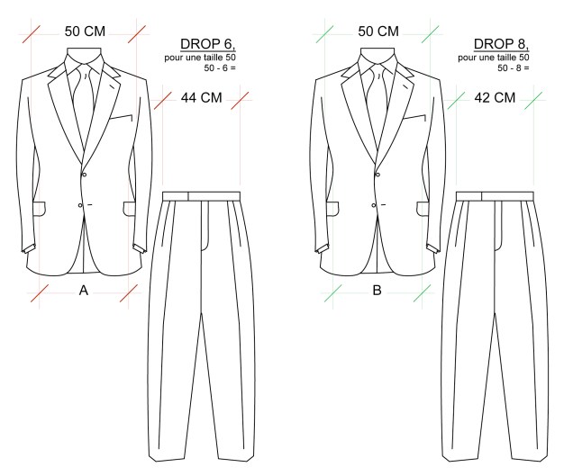 Poussons plus loin. Le drop aura une influence (mais pas de rapport direct à ma connaissance) sur le tour de taille de la veste (A ou B sur le schéma). A priori, une veste en drop 6 est coupée plus droite qu’une veste en drop 8, qui sera plus cintrée. Car le tour de taille du pantalon et le tour de taille de la veste sont assez proches en réalité. Ils se chevauchent. Pour que l’un emboite bien l’autre, il faut un rapport logique, mais qui dépend du goût du modéliste/styliste. Sachant qu’une veste est plus facile à cintrer que l’inverse…