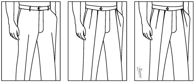 Le haut devant du pantalon peut être parfaitement plat, c’est de loin l’option la plus courante de nos jours, et qui du reste est historiquement la plus valide. Jusque dans les années 20, les pantalons arboraient des devants plats, sans plis, mais en revanche avec beaucoup de bassin, signe stylistique du temps où les hommes étaient dessinés comme des garçonnets. Puis, les années 30 et le mythe du bel homme grand et fort virent arriver les plis, un puis deux puis trois etc. J’ai déjà vu un pantalon 1940 avec un pli faisant 8cm ! (en fait 4 x2 car c’est un repli).
