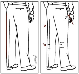 Généralement, la belle ligne à l’arrière du pantalon veut que le pli parte du plus fort de la fesse en ligne droite jusqu’à la chaussure. Le pli central en ‘droit fil’ structure alors la silhouette. Les fesses ne doivent pas être mises en évidence, les genoux ne doivent pas être à l’étroit et la poche ne doit pas servir de ‘relarge’.