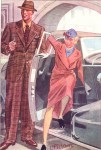 Que pouvons-nous voir sur ces illustrations ? Un homme tenant la portière à une dame, dans une tenue très décontractée (coloris, motif) mais pas forcément trop campagne encore / Deux hommes discutant, l’un en dépareillé, l’autre en costume vert, gilet croisé et souliers marrons (pas des banquiers, cela saute aux yeux) / Un jeune homme en prince de galles fenêtré rouge qui à l’évidence ne doit pas trainer de la sorte dans un cadre champêtre, mais qui possède en ville un caractère très ‘sport’ / Et enfin un homme chez un buraliste, avec un tenue de samedi idéale, ensemble marron.