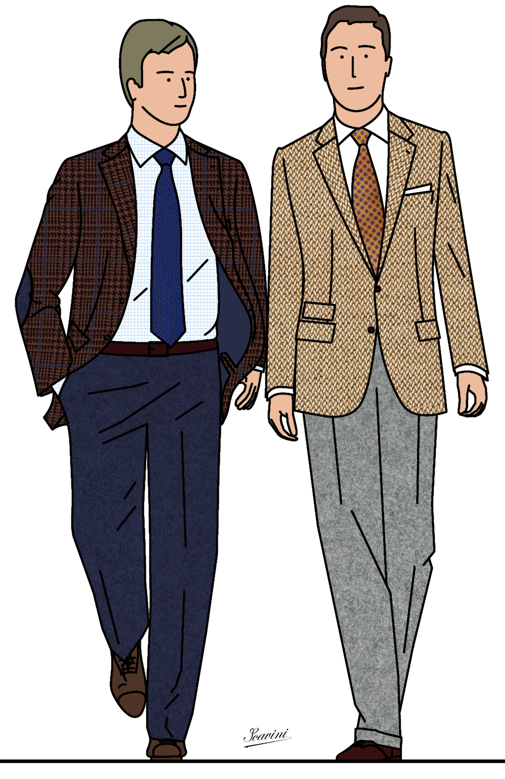 A la ville, pour paraitre décontracté, on pouvait donc avoir recourt aux ensembles dépareillés, à la différence du costume, où tout est ‘de même’. Le dépareillé se construit assez généralement sur un pantalon de flanelle gris (tous les gris, du plus clair ou plus foncé) ou de certains laines froides – grises aussi – pour l’été. De temps à autres, les pantalons à petits chevrons marrons pouvaient être utilisés, mais cela donne des difficultés de coordination avec la veste. Au dessus de ce pantalon, une veste. Et là, grande liberté possible : à poches à rabats ou à poches plaquées, unie ou à motifs. Le plus souvent du reste, la veste à carreaux est utilisée, pour trancher sur le pantalon uni et apporter une bonne dose de peps. Cette version du dépareillé a encore tout à fait cours de nos jours. Avec souliers marrons s’il vous plait, il convient bien de souligner le caractère décontracté d’un tel ensemble.