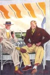 Dans Apparel Arts, que pouvons nous voir comme tenues décontractées ?  Difficile choix, car évidemment ce genre de tenue n’était pas monnaie-courante. 1- Au club de cricket ou de tennis, un monsieur en complet blanc, l’autre en veston sport. Mais un simple veston. A remarquer, le port de chaussettes blanches de sport, très américain. Ils le faisaient dans les années 60 y compris avec le costume ‘sack suit’. 2- Une tenue estivale pour le yachting. Ici c’est la chemise qui se transforme en veste, pour s’approcher de ce que l’on appelle un ‘saharienne’. 3- Tenue pour la plaisance encore. Mais en version pêcher, avec un pull de type St James et des souliers de toile, déjà existant à l’époque ! 4- Deux choses intéressantes ici : à l’arrière, un jeune homme portant un bomber similaire à celui dessiné aujourd’hui et au premier plan avec le club, le monsieur porte une bien étrange veste, qui a l’air d’être réalisée en jersey, c’est à dire une sorte de veste tricot. Je n’y vois pas de revers. Un cardigan amélioré peut-être…