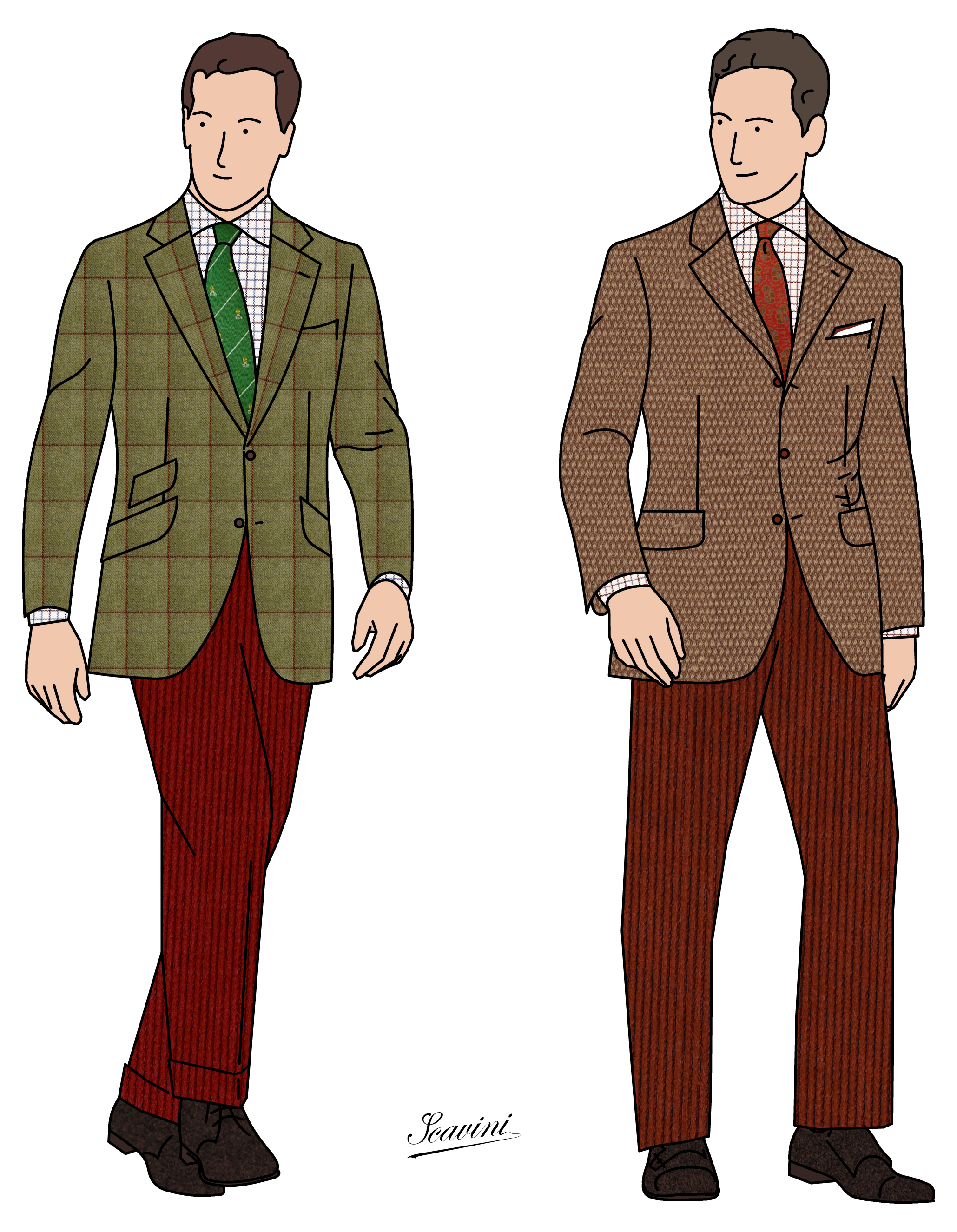 La veste dépareillée à carreau est british. Trop british pour le goût français qui aspire à un peu plus de délicatesse, au raffinement. Le carreaux rouge sur un tweed vert, c’est voyant ! L’esprit français serait peut-être plus enclin à apprécier les tissus unis, tweed également, mais proposant soit des tissages particuliers (chevrons fondus, grain de riz, etc…), soit des couleurs plus étudiées (rouilles, chamois, vert d’eau, etc…).