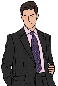 Ensuite, la chemise rose va assez bien avec le gris foncé, l’anthracite. Evidemment me direz-vous, le gris étant une non couleur, il s’accommode parfaitement d’une couleur, ici le rose. Logique. La veste étant maintenant foncé et le rose pâle, je pense que la cravate doit être assez forte, pour équilibrer chromatique vers le haut l’ensemble. Une cravate violette, assez profonde, dynamise la tenue.