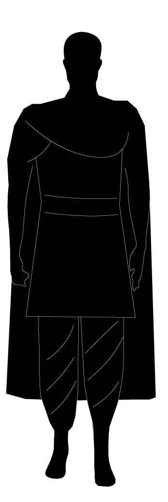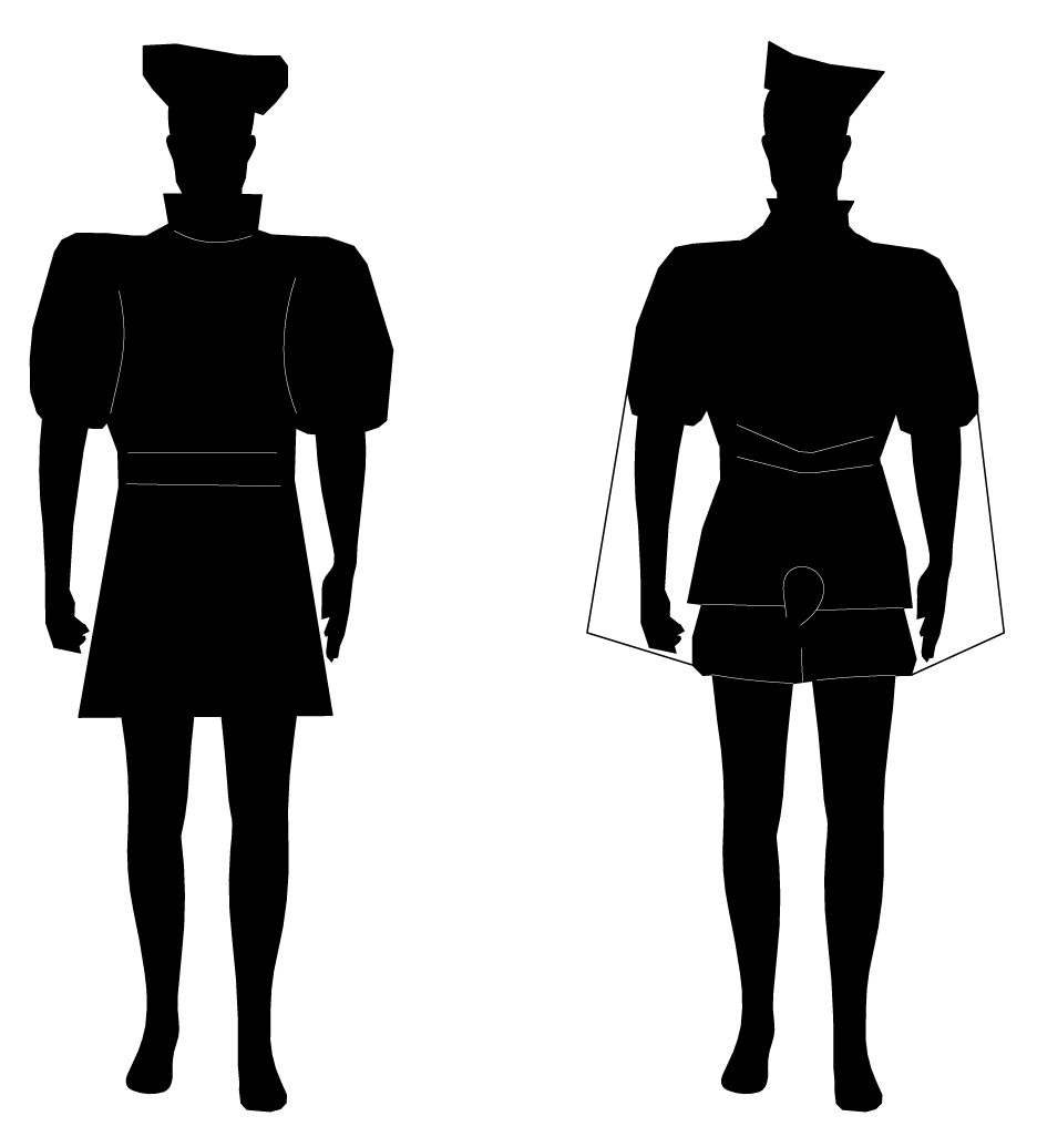 CAPÉ, TAILLE PINCÉE. L’encolure est dégagée. Les épaules sont naturelles, car les drapés sont simples. Les bras sont gainés. Le vêtement principal est ceinturé à la taille et se finit en jupon, à mi cuisse. Les jambes sont aussi enveloppées et les pieds sont enveloppés par un chausson bas voire légèrement montant. L’ensemble est capé pouvant donner une impression de volume contraire à la tenue en dessus, très près du corps.