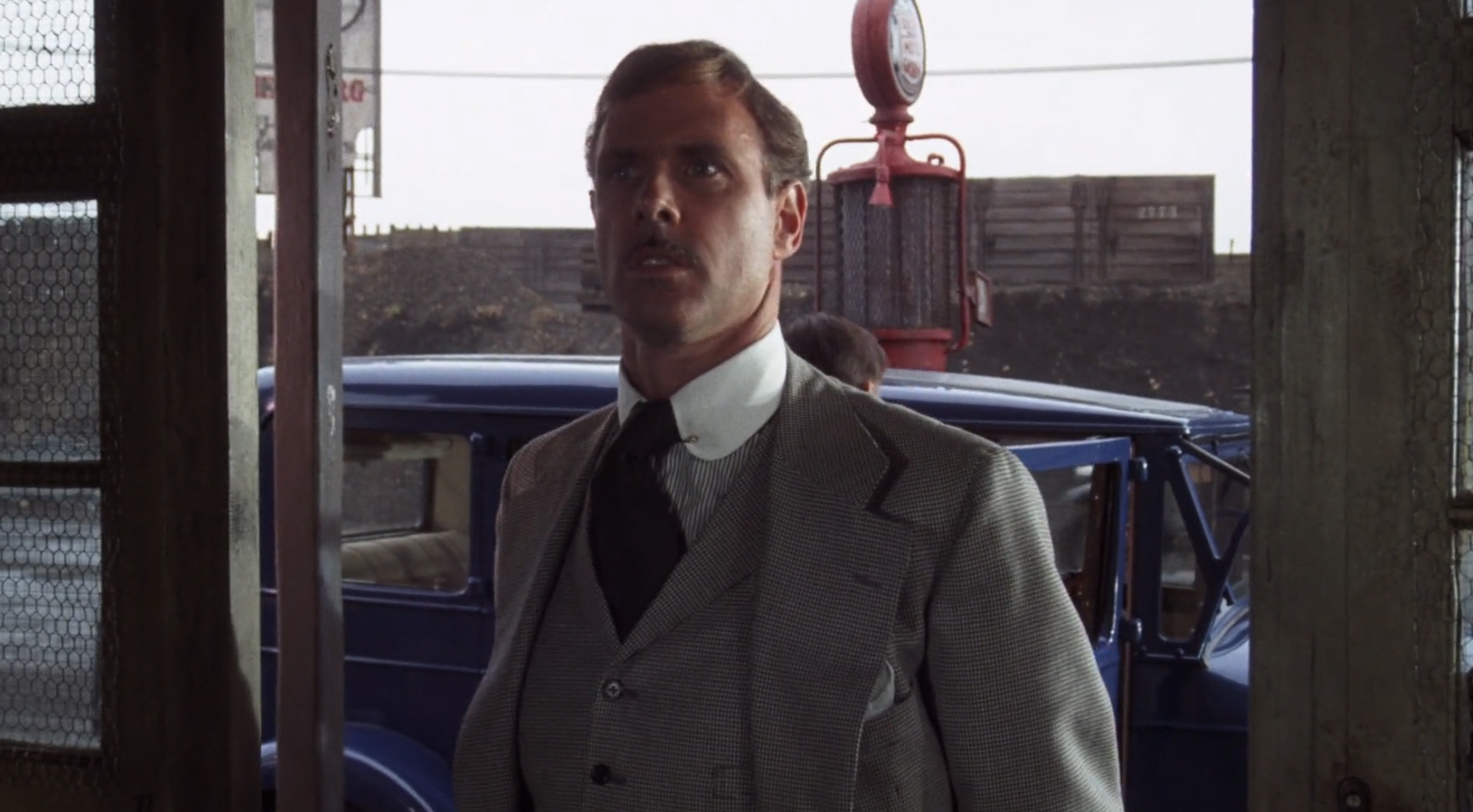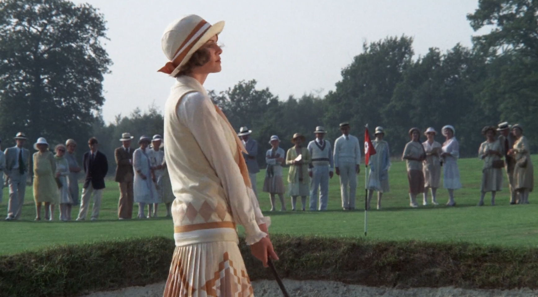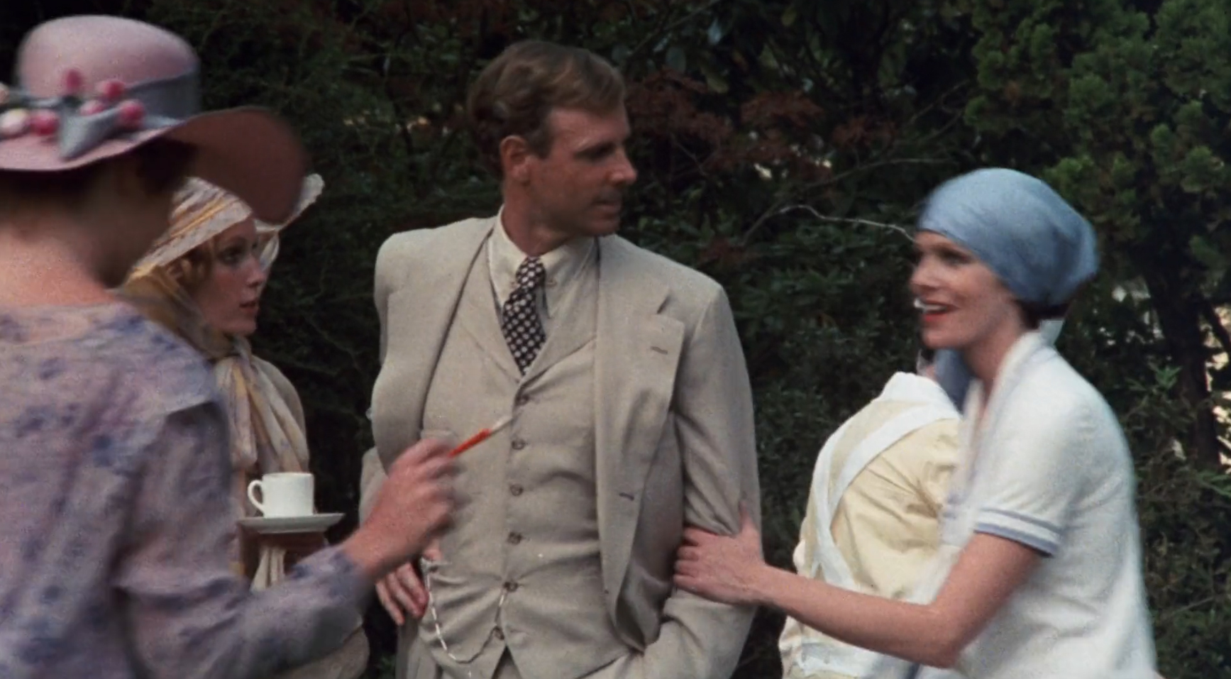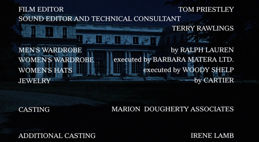 Évidemment, la question que tout le monde a sur les lèvres d’abord. Et Ralph Lauren ? Oui, oui, Ralph Lauren a bien réalisé les costumes masculins. Il est d’ailleurs dûment crédité au générique, voyez ci-dessous. Il faut mentionner que la costumière « en chef » Theoni V. Aldredge a reçu un Oscar de la meilleure création de costumes. L’intitulé du générique laisse penser que Ralph Lauren a pensé les costumes également, comme le suggère la mention « by » alors que pour les femmes, « wardrobe et hats », il est écrit « executed » laissant penser alors à une simple exécution sur commande.