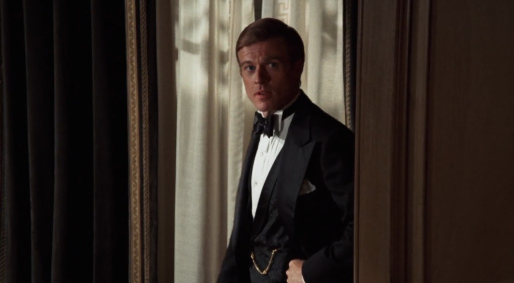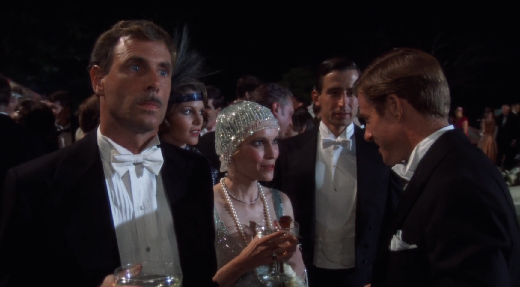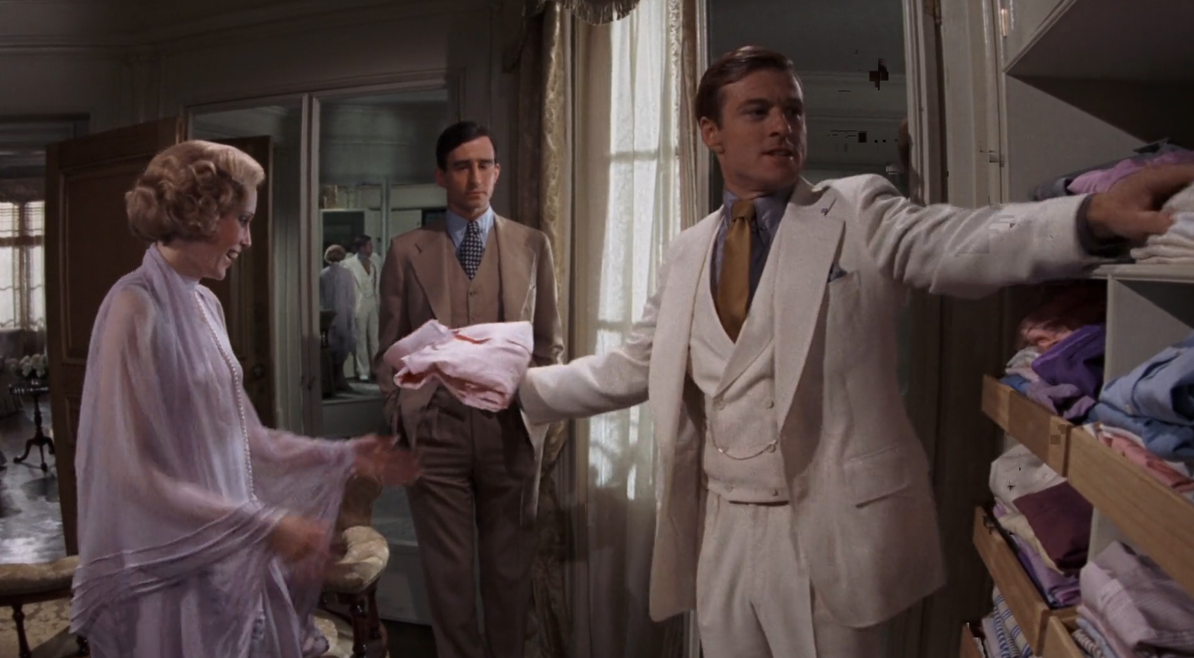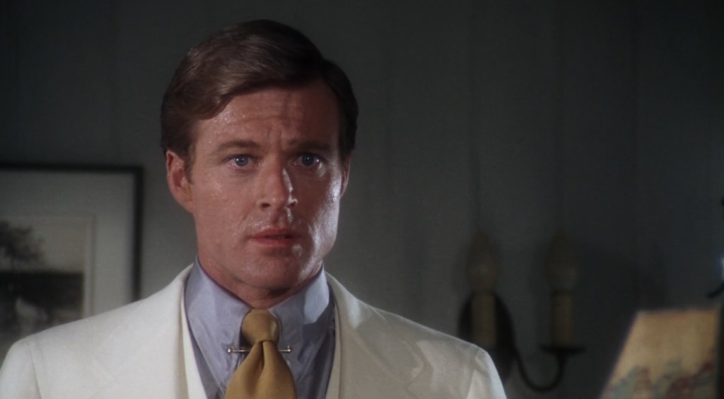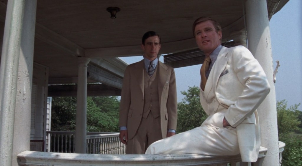 Passons ensuite à Gatsby, joué par Robert Redford. Personnage énigmatique, il apparait doucement dans le film. J’ai d’abord remarqué le gilet du smoking, réalisé dans une soie jaquard, avec une texture donc. Intéressant.