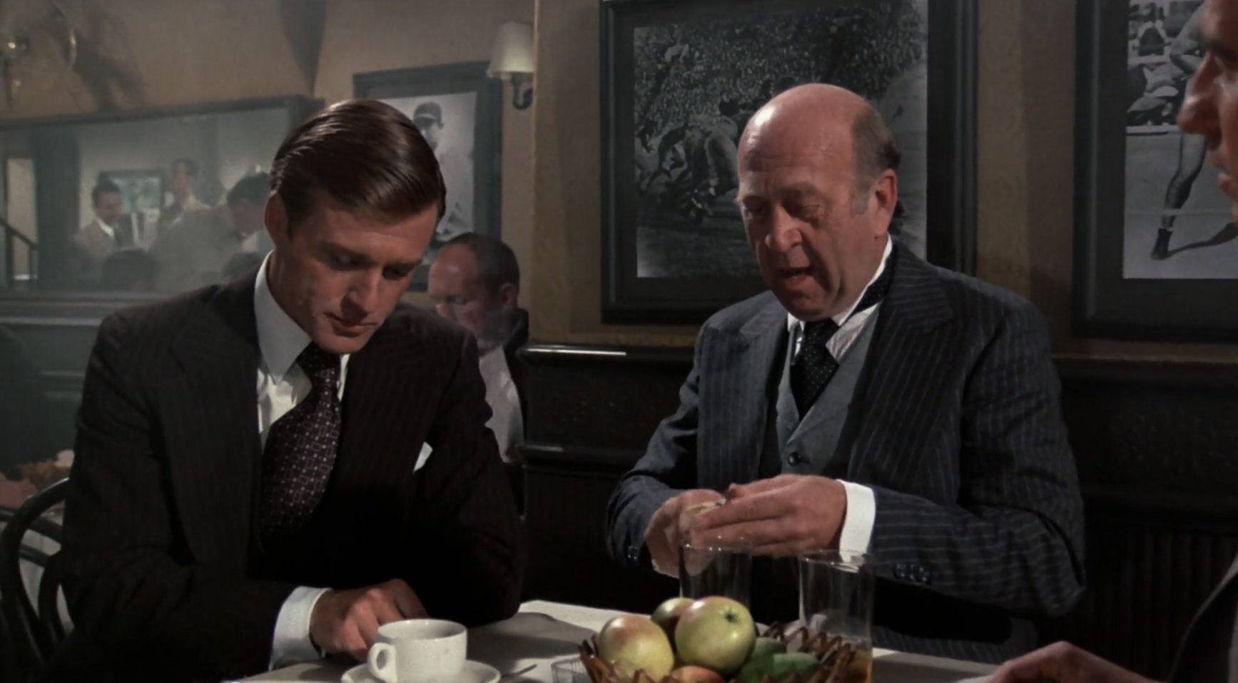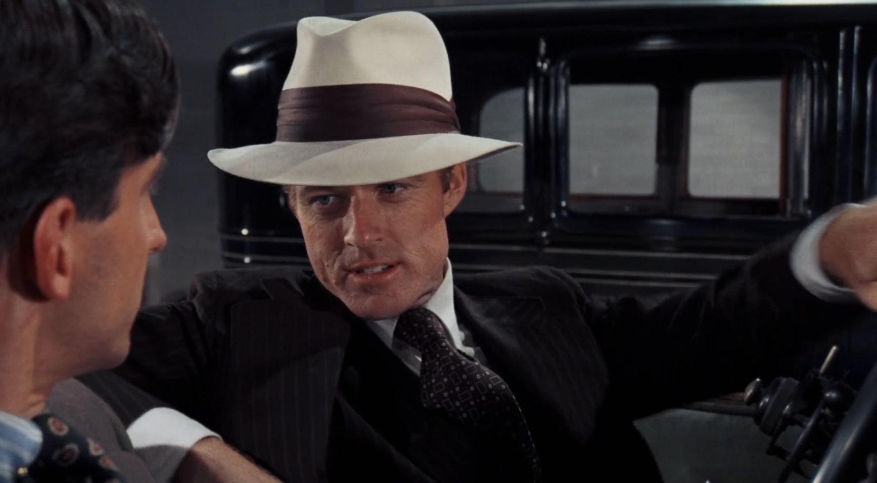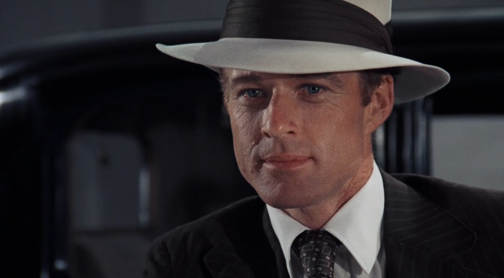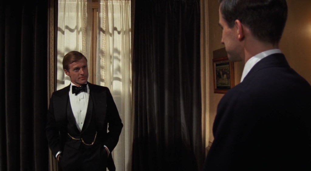 Passons ensuite à Gatsby, joué par Robert Redford. Personnage énigmatique, il apparait doucement dans le film. J’ai d’abord remarqué le gilet du smoking, réalisé dans une soie jaquard, avec une texture donc. Intéressant.