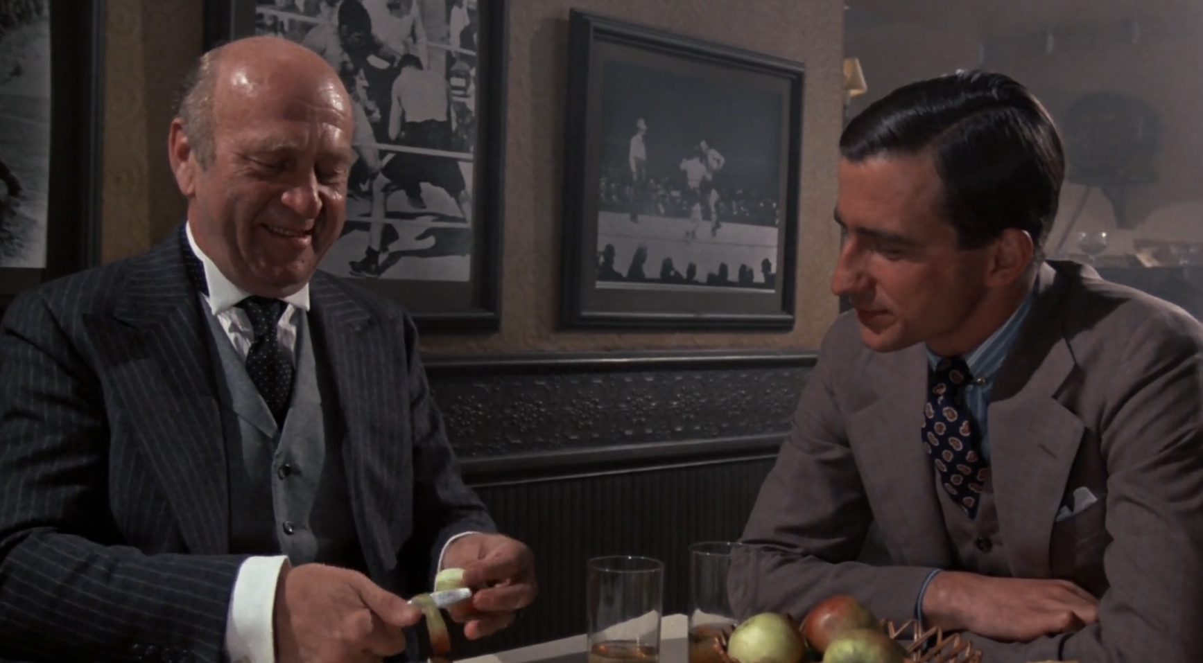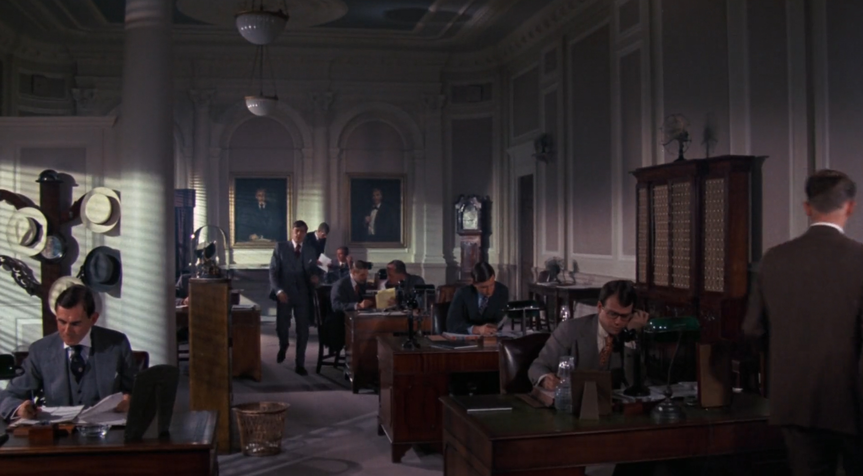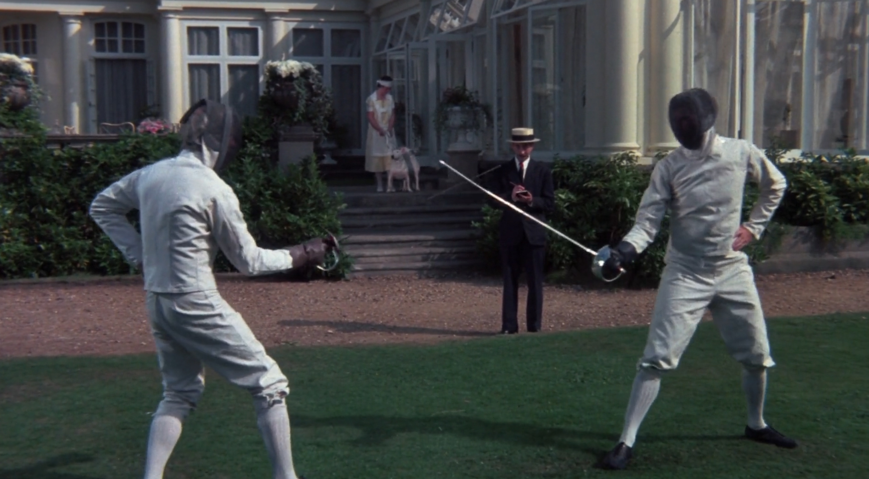 Pour finir ce soir, quelques vues générales du film. Une splendeur qui fait très vite oublier des minuscules défauts. Qui n’en sont pas d’ailleurs. 1- Amusante veste de régate. 2- Exquis panorama au golf. 3 & 4- l’agent de change avec son « stroller », l’équivalent plus simple de la jaquette, mais à veste rayée (ce sont des américains, ils ne savent pas les pauvres). 5- le bureau de Nick à New-York. 6- Le grand escalier, cette contre-plongée, quel plan ! 7- Petit cours d’escrime ; l’arbitre est d’une grand dignité. 8 & 9 – notre belle petite assemblée aux tons pastels.