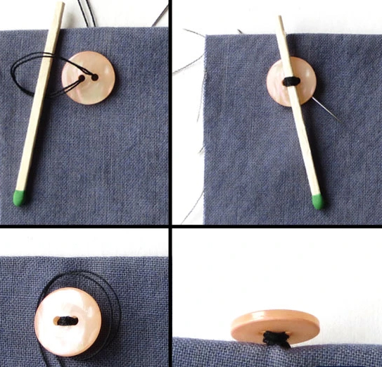 Normalement, le bouton présente une petite queue à sa base. Elle est réalisée en laissant du « mou » lors de la couture du bouton, puis ce « mou » est entouré de fil, comme un ressort, ce qui donne comme un pied. Le bouton est plus facile ainsi à passer dans les boutonnières. Y compris sur les belles chemises. Les machines à coudre bas de gamme des industriels bas de gamme cousent les boutons sans queue. Le coup de l’allumette pour être sûr de laisser le bon « mou » est super, mais il prendre beaucoup trop de temps!