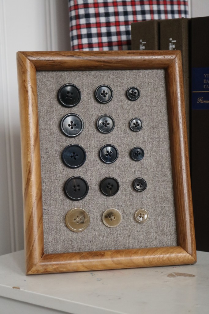 Dans ma boutique, je présente les boutons sur cette petite planche. A gauche, le 25mm à manteau, au centre, le 19mm à veste, à droite le 15mm pour manches de veste. Manque donc le modèle manche de manteau. Le gilet se contente du plus petit modèle à droite, comme le pantalon :