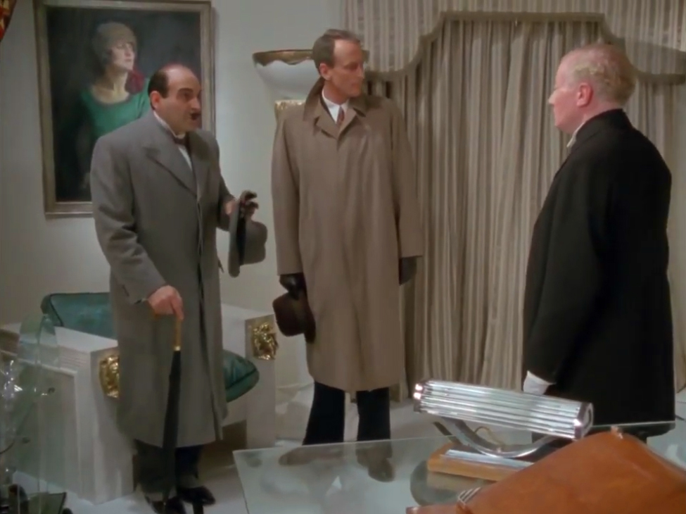 Poirot et Hastings mènent l’enquête. Le premier n’a guère changé de tenue depuis la veille : manteau sous les genoux, camouflant un costume trois pièces gris souris, veste trois boutons col pointe et gilet croisé. Hastings lui a troqué l’ensemble sport contre le croisé à fines rayures recouvert d’un imperméable raglan. Remarquons la cravate et le papillon qui apportent une heureuse touche de couleur.