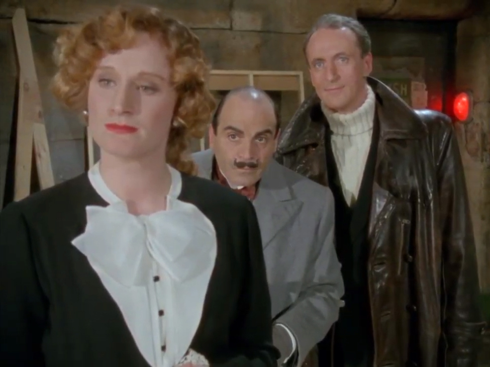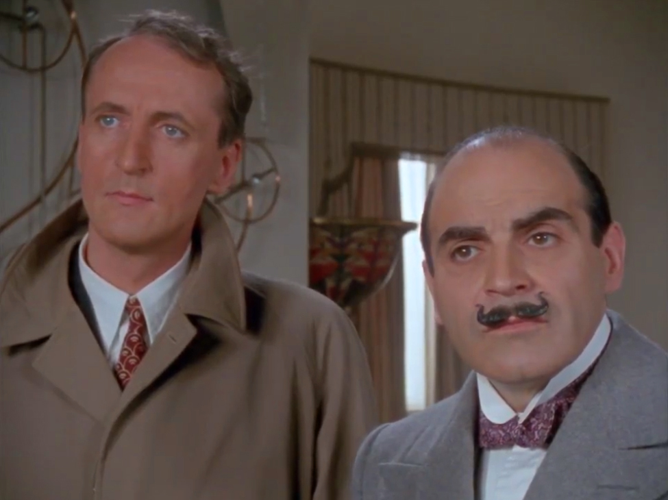 Poirot et Hastings sont arrivés sur le plateau pour observer le tournage. Si le détective belge est toujours sur son « 31 », le capitaine lui aime les ensembles un peu plus sport, qui vont bien avec sa voiture coupé cabriolet. Le pull coll roulé est du type « arran » avec ses larges torsades. Le trench-coat en cuir a beaucoup d’allure, mais n’est plus très à la mode depuis François de Grossouvre.