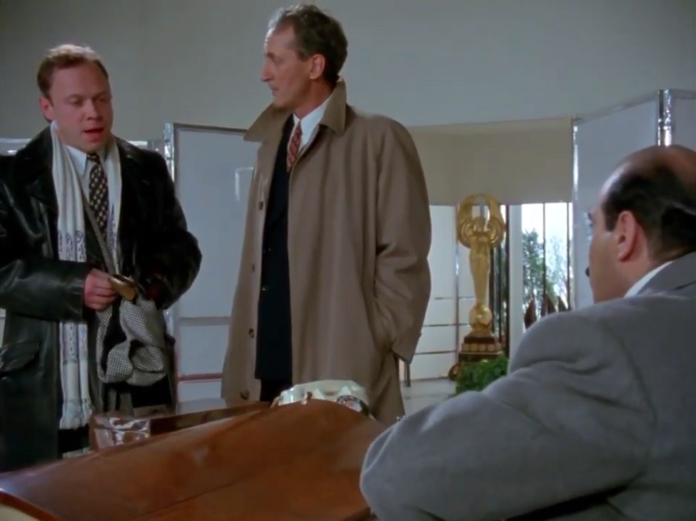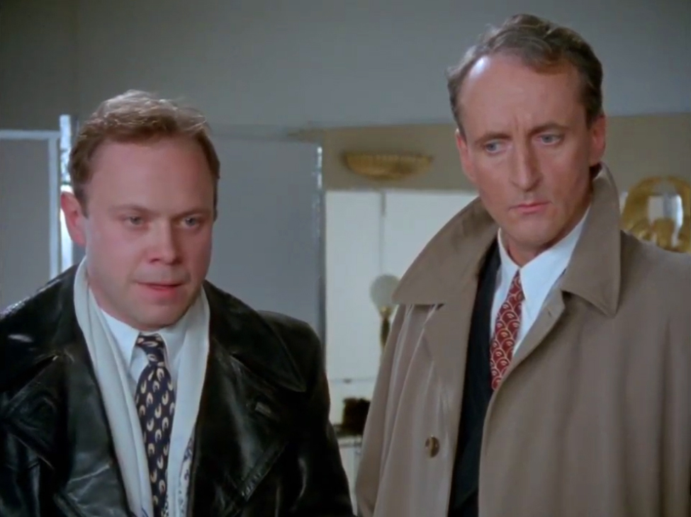 Les deux limiers interrogent Bunny Saunders qui était dans les parages. Tiens tiens… Il porte aussi le trench en cuir. Noir qui plus est. Tout un style. On ne l’aperçoit que peu de temps, il porte des chaussures bicolores noir et blanc, ce qui rajoute au tapage visuel.