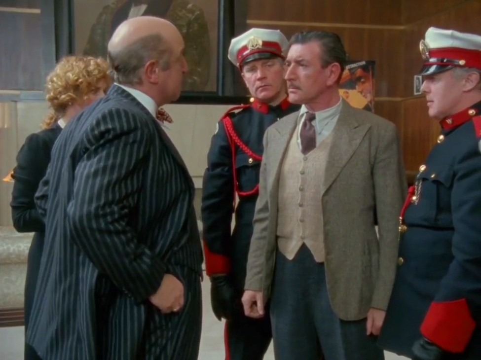Le 12 mars 1989, la chaine de télévision anglaise iTV diffusait le 9ème épisode de la saison 1 d’Hercule Poirot avec David Suchet, basé sur une nouvelle d’Agatha Christie de 1923. Poirot et son associé le capitain Hastings sont invités sur le tournage du prochain film de Bunny Saunders, un ami réalisateur. Le directeur du studio, Henry Reedburn, devient très vite le centre d’intérêt de l’épisode. Il est infect et ne salut même pas Poirot. Que va-t-il se passer? Comme d’habitude, cette production est d’un excellent niveau en ce qui concerne les vêtements. Ce directeur justement, il porte un costume trois pièces, bleu nuit à très fortes rayures craies. Le gilet est droit, le col de la veste en pointe et le pantalon généreusement opulent. Très joli nœud-papillon aux motifs cubiques :