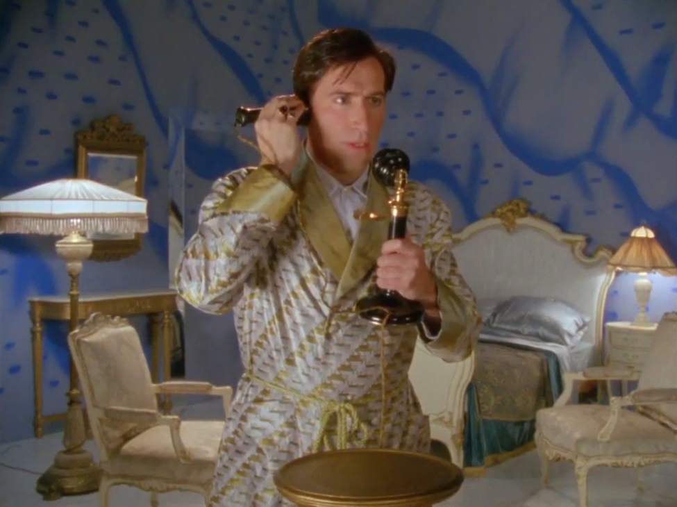 Les évènements s’enchainent. Le Prince Paul de Maurania qui est intime de l’actrice principale appelle Poirot dont il est ami. Les choses tournent au vinaigre au studio. Si la chambre est le décor le plus ringard qui soit ( on s’étonne d’ailleurs d’une telle économie stylistique ), la robe de chambre est très belle. Je n’arrive pas clairement à voir si elle est boutonnée en plus de la ceinture.