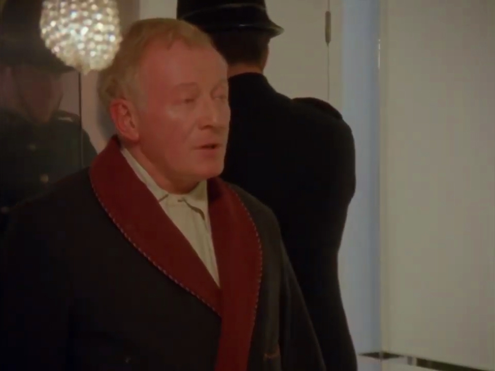 Puis que l’on est aux robes-de-chambre, regardons celle du majordome qui ouvre à la police sur le lieu du meurtre présumé. Simple opposition de marine et de rouge avec passepoil bicolore. Superbement simple, superbement suffisant :