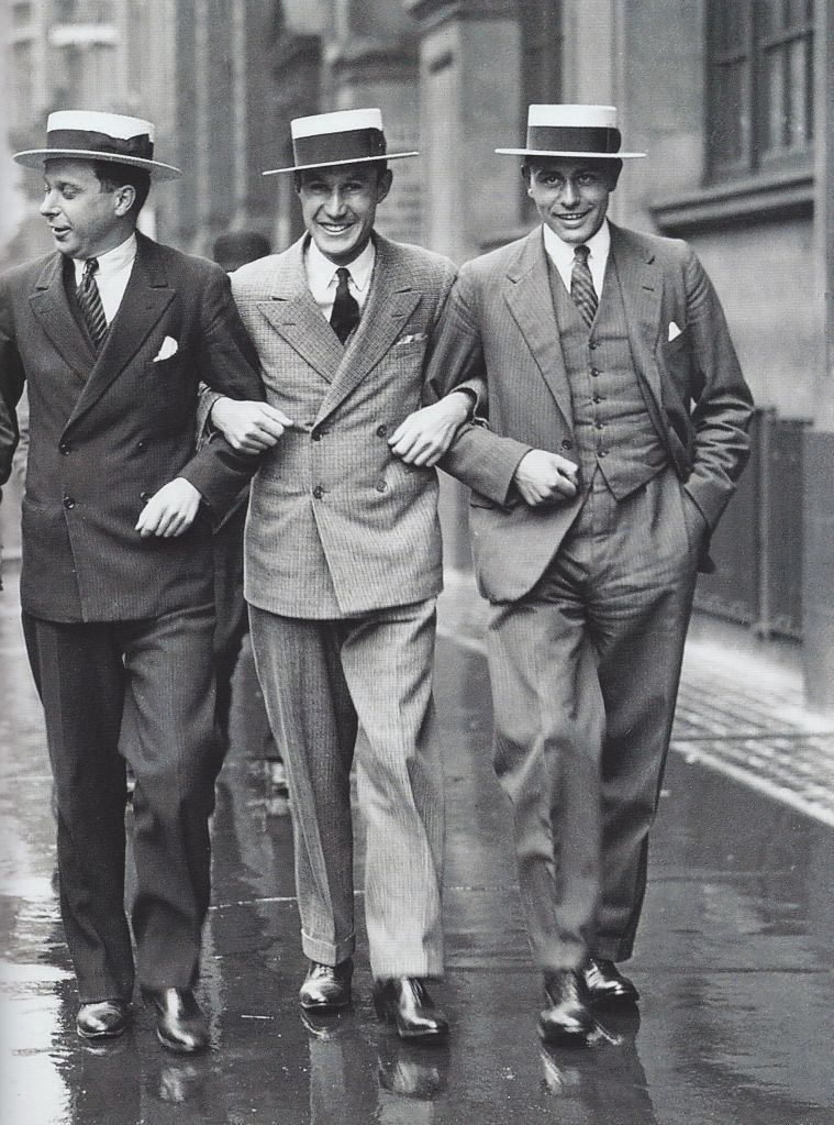 Après avoir dit cela, force est de constater que cet arrondi peut varier suivant les époques. Dans les années 1920, on l’aime très peu marqué, presque martial, avec un boutonnage très haut placé, donnant des basques très longues comme sur cette photo très typée d’une veste 1 bouton aux pans gigantesques. Toute une allure avec des épaules naturelles sans padding! Déjà à l’époque.