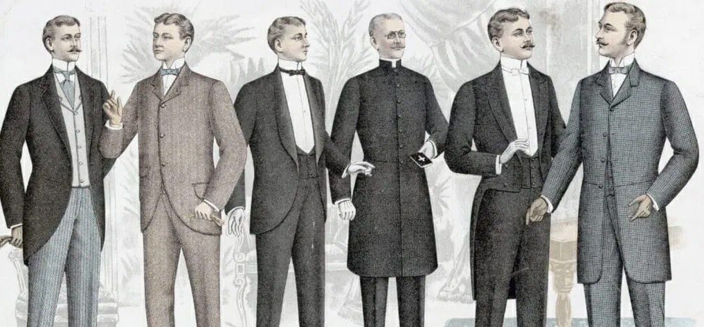 Toutefois, cette mode très typée si elle remplie les magazines de mode (avec des pantalons très étroits et courts, typiques des dessins de JC Leyendecker), la majorité des tailleurs utilisent la même courbe, celle du perroquet d’architecte comme on peut le voir sur cet autre groupe de messieurs en 1920, il y a cent ans donc ! Des vestes aux courbes classiques et sans variation sur le siècle écoulé.