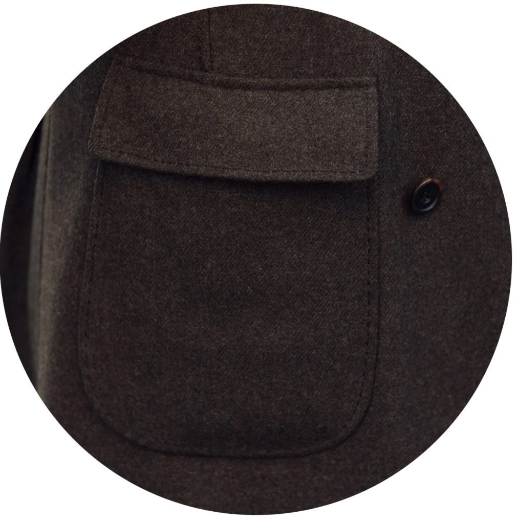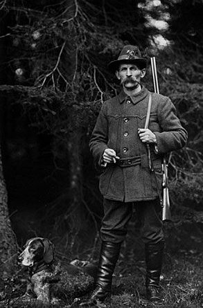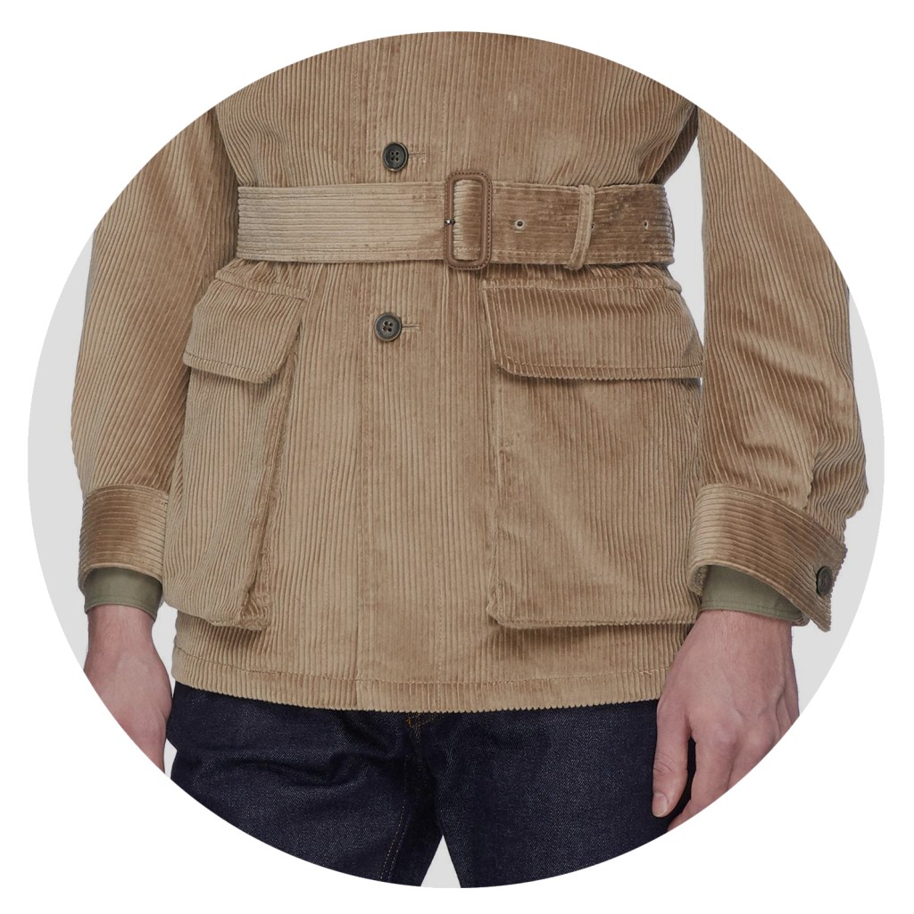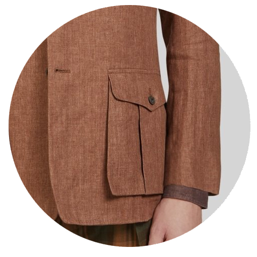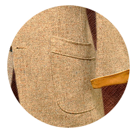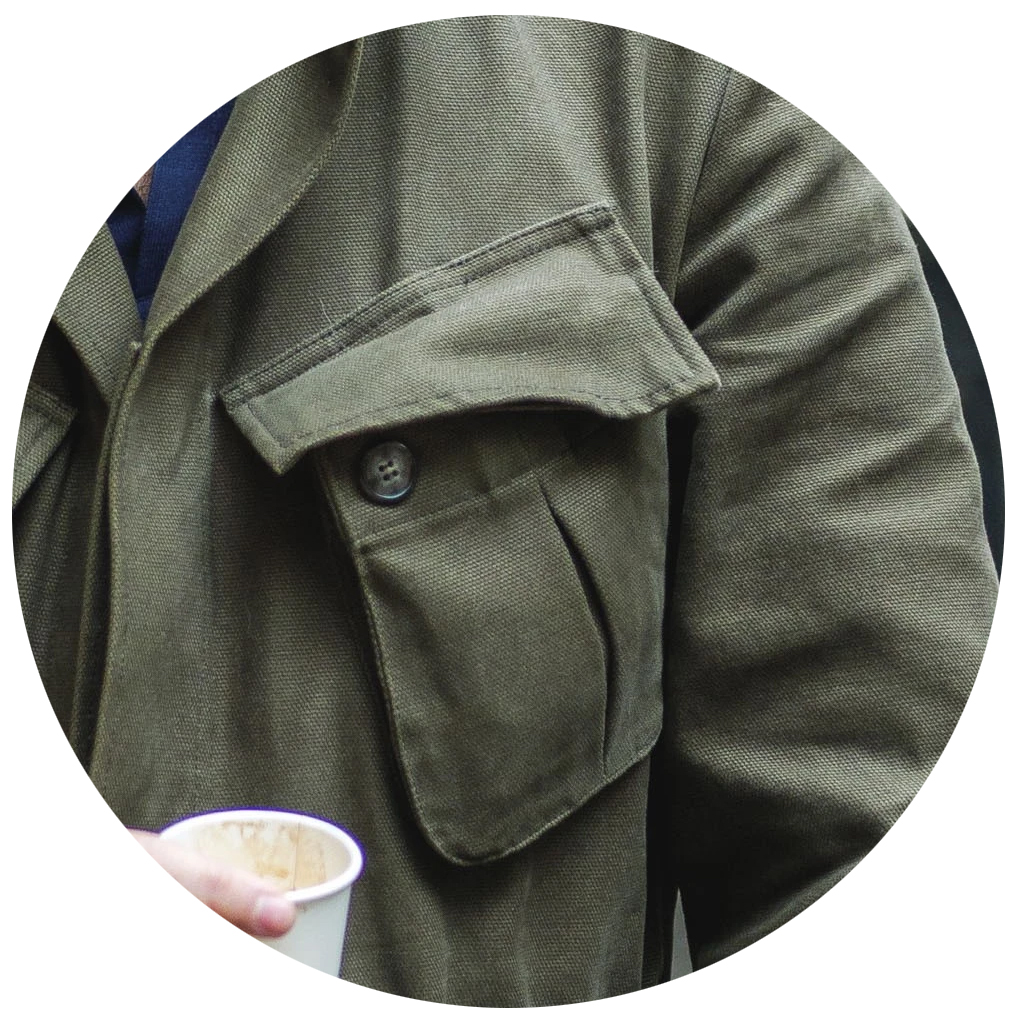 Car il faut bien l’avouer, une coupe à angle droit du bas de la veste engonce un peu l’homme et rend le mouvement mal-aisé. Toutefois, pour être couvert au mieux, et avec l’entrejambe protégée de la pluie, rien de mieux. C’est pourquoi dès cette époque, les tuniques et vareuses militaires et de chasse sont découpées en angle droit. Ci-dessous un soldat anglais en tenue de l’époque Guerre des Boers (1899) et à côté un garde chasse en 1911 avec une veste genre norfolk. Avec l’angle droit, le statut ambivalent de veste d’apparat et/ou de lourd vêtement utilitaire est consacré.