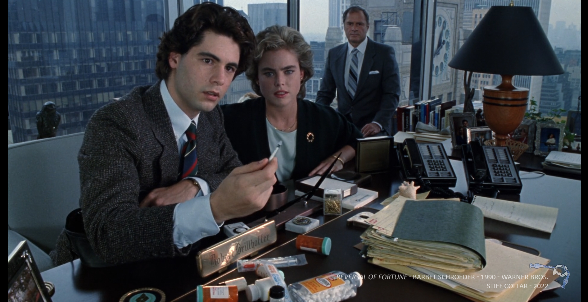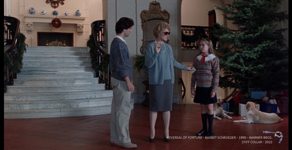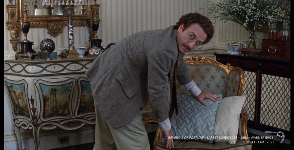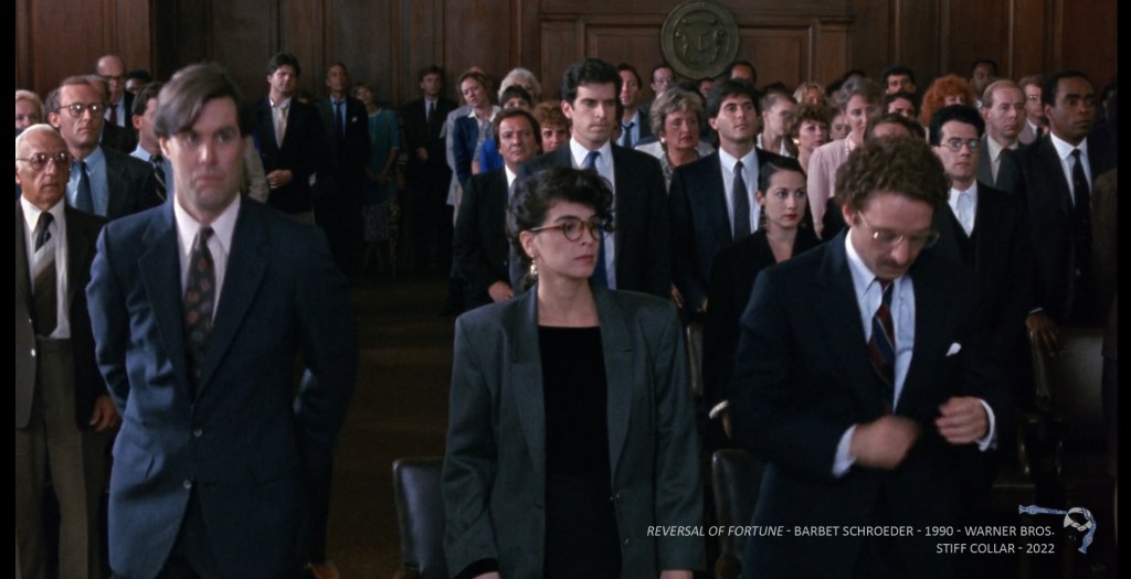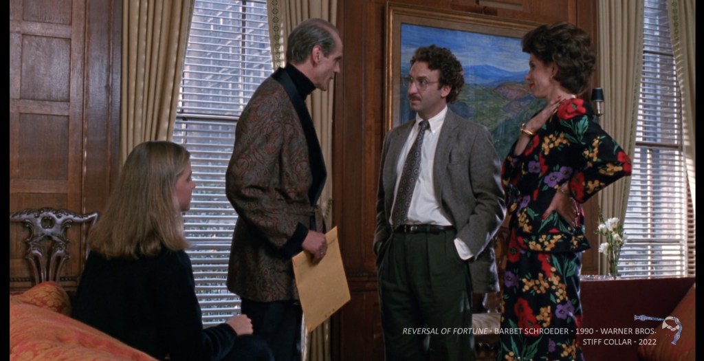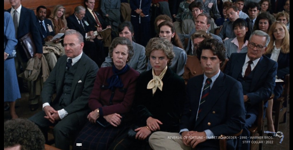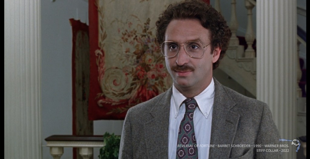 Trois personnages ont attiré mon attention : Jad Mager jouant le fils de Sunny von Bülow Alexander von Auersperg, Ron Silver jouant l’avocat Alan Dershowitz, auteur du livre dont est tiré le film, et bien sûr Jeremy Irons en Claus von Bülow. Trois vestiaires tout droit sortis des années 1980. Revue. Les costumes sont signés d’une jeune costumière à l’époque, Judianna Makovsky.
