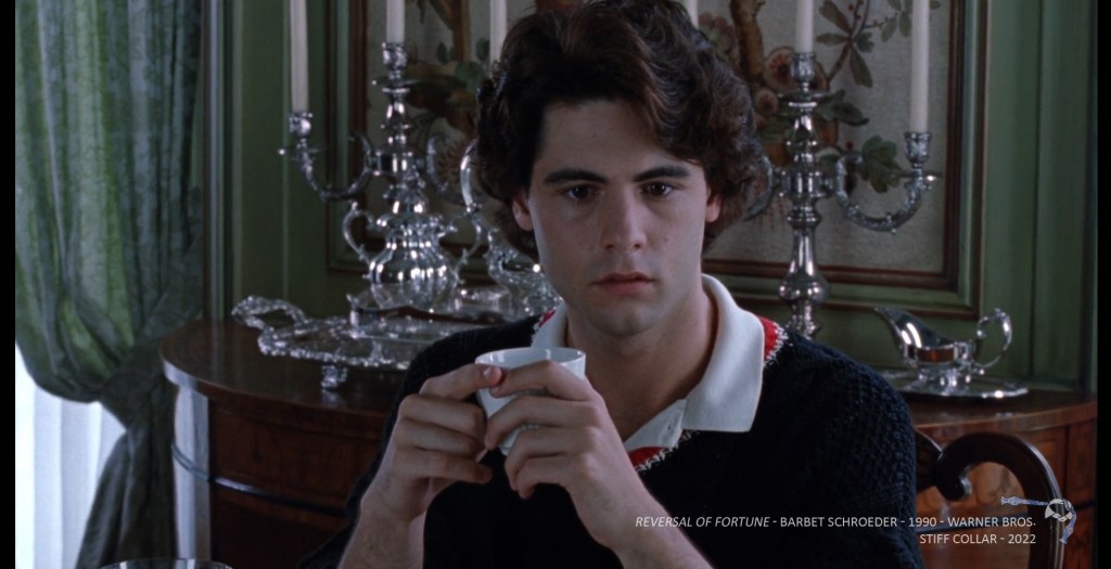 Lançons nous sur Jad Mager jouant le fils de Sunny von Bülow Alexander von Auersperg. Le personnage a entre 20 et 23 ans suivant les instants du film. Son vestiaire est celui d’un garçon ayant fréquenté la Ivy League. Pull cricket, pantalon de velours et mocassins à pompons. Les dimensions sont généreuses, marqueur d’une époque. Admirez aussi cette argenterie de dingue !